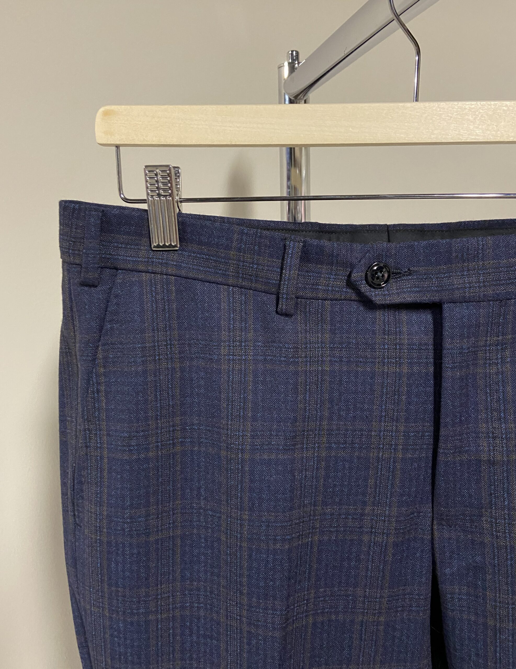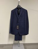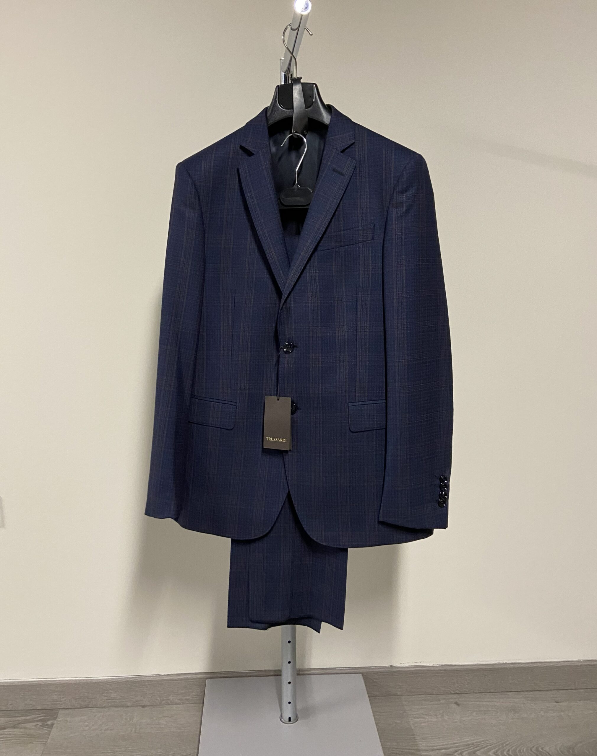 Abito da uomo del marchio Trussardi. Monopetto con chiusura a due bottoni, revers classico, due tasche esterne con pattina e un taschino a filetto sul petto.