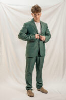 E’ un completo verde oliva monopetto e a due bottoni, caratterizzato da una leggera trama spigata o a spina di pesce, include tasche con pattina e un taschino sul petto.