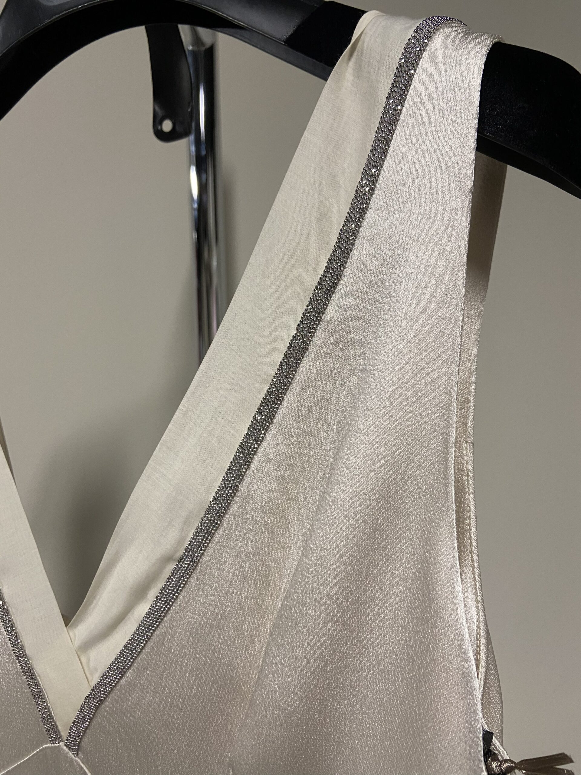 Presenta uno scollo a V profondo sul davanti.