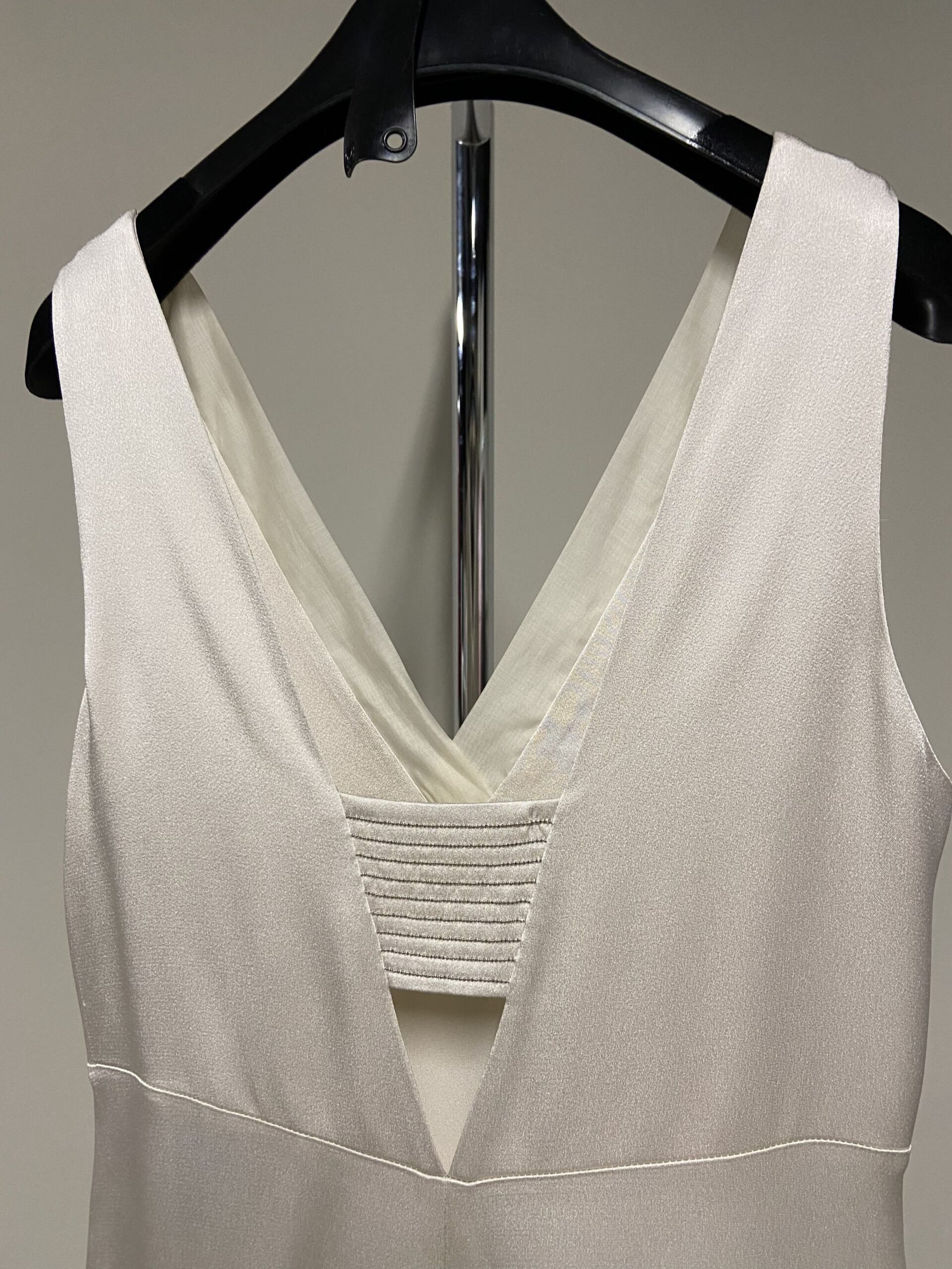 Il retro è caratterizzato da un’ampia scollatura a V, con spalline sottili incrociate al centro della schiena. Un inserto con lavorazione ad arricciatura elastica è posizionato alla base della scollatura posteriore.