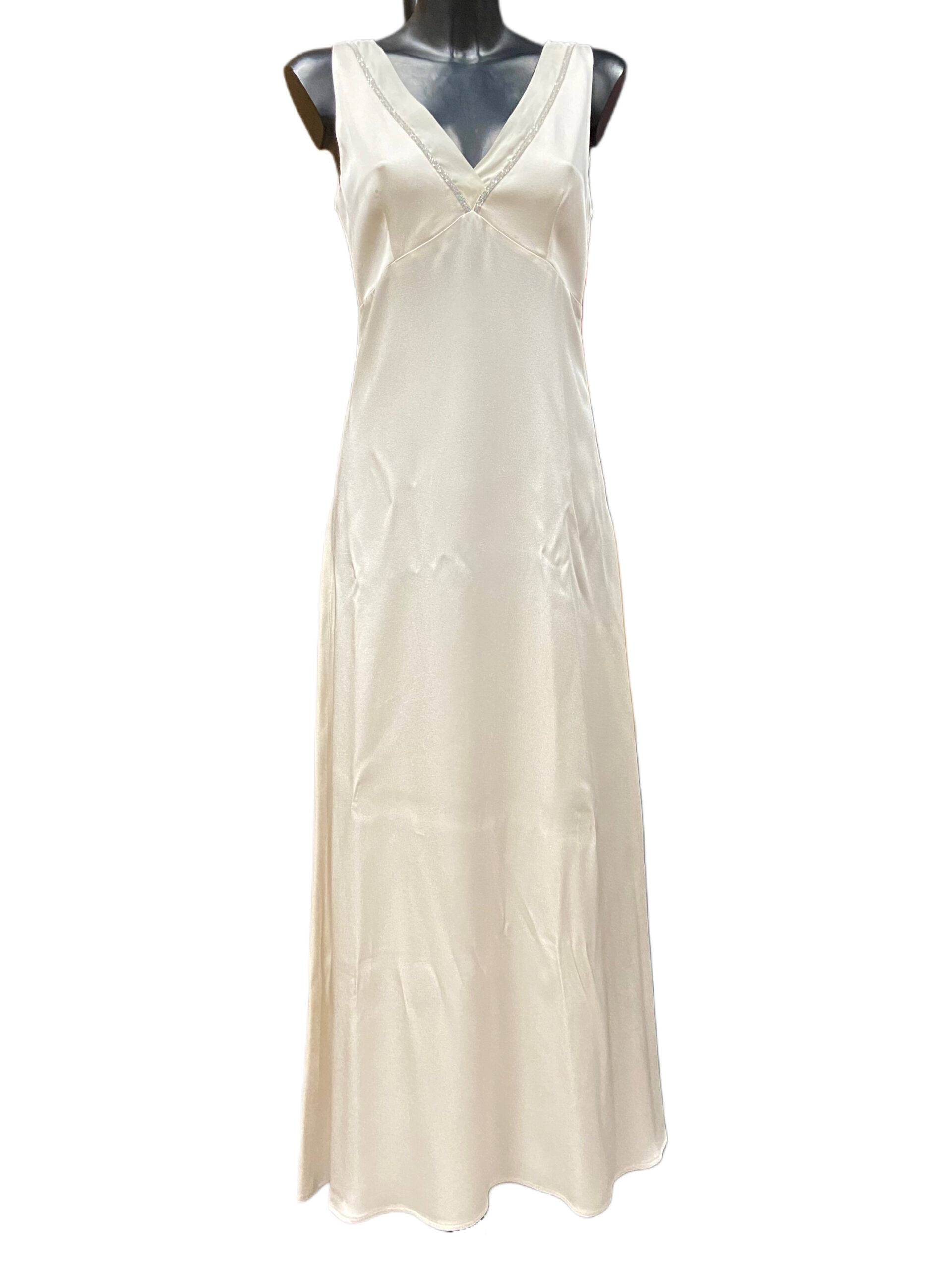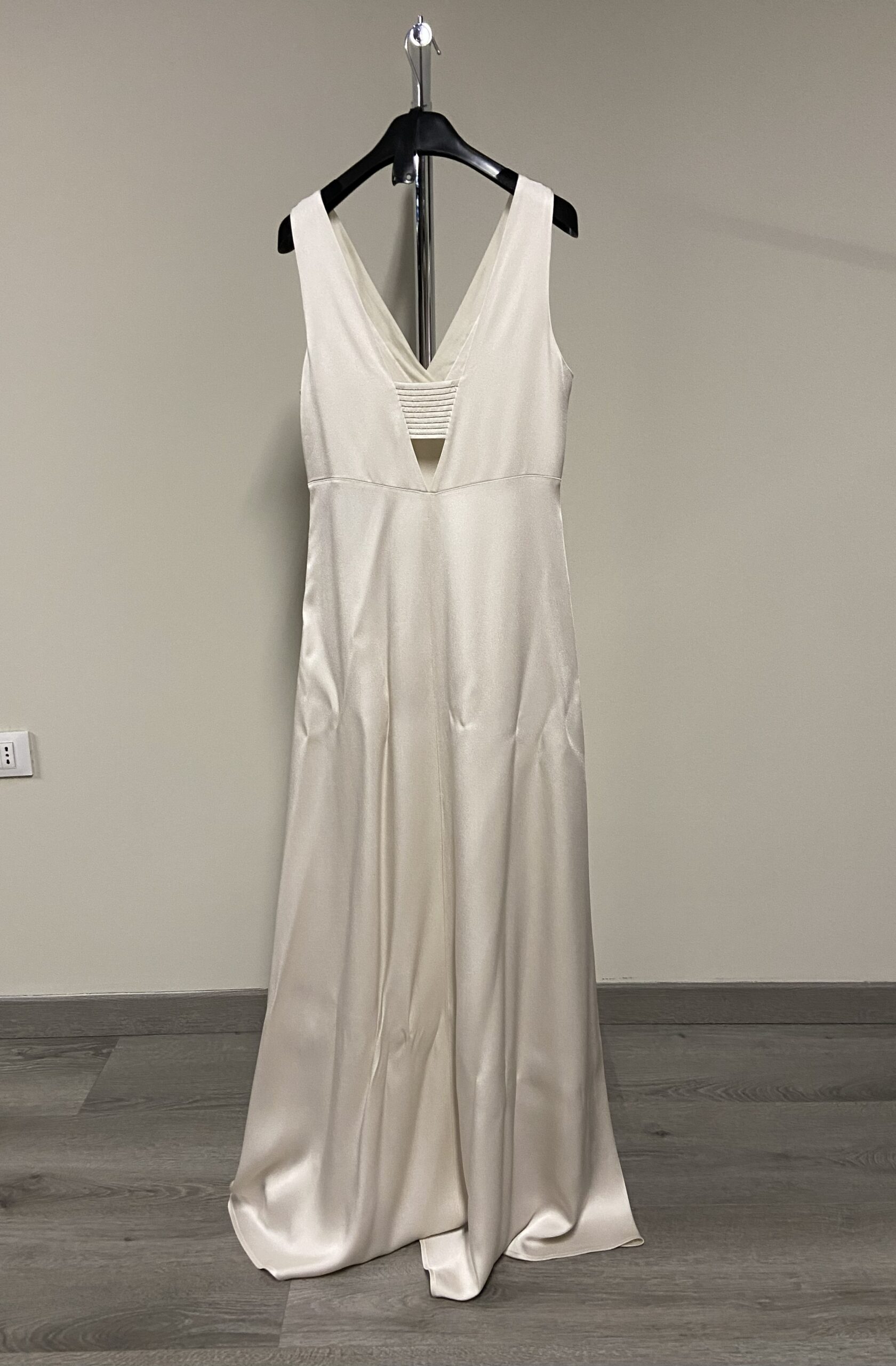 I dettagli costituiti da una sottile catena di strass, impreziosiscono le spalline e i profili dello scollo. L’abito è senza maniche.