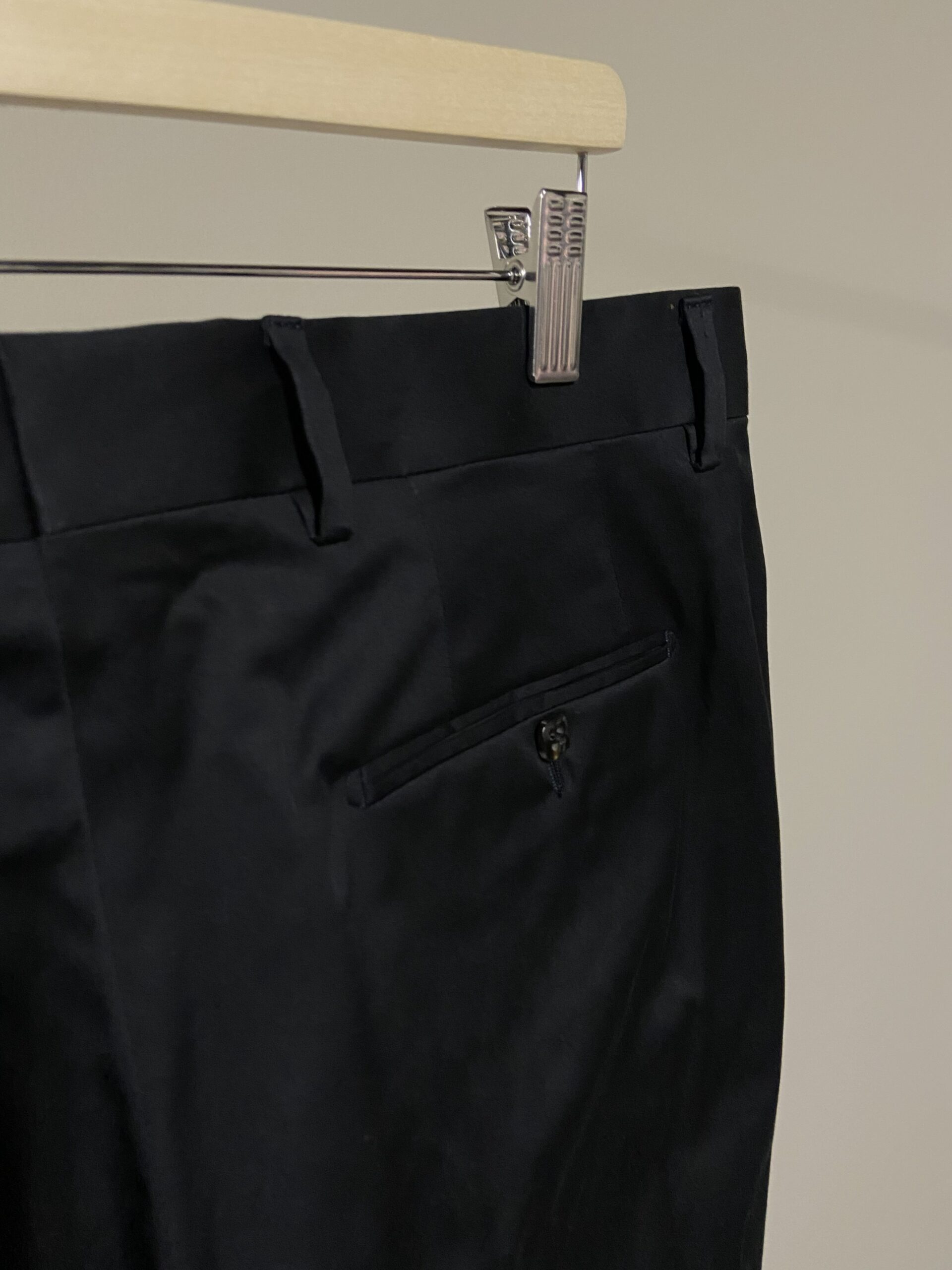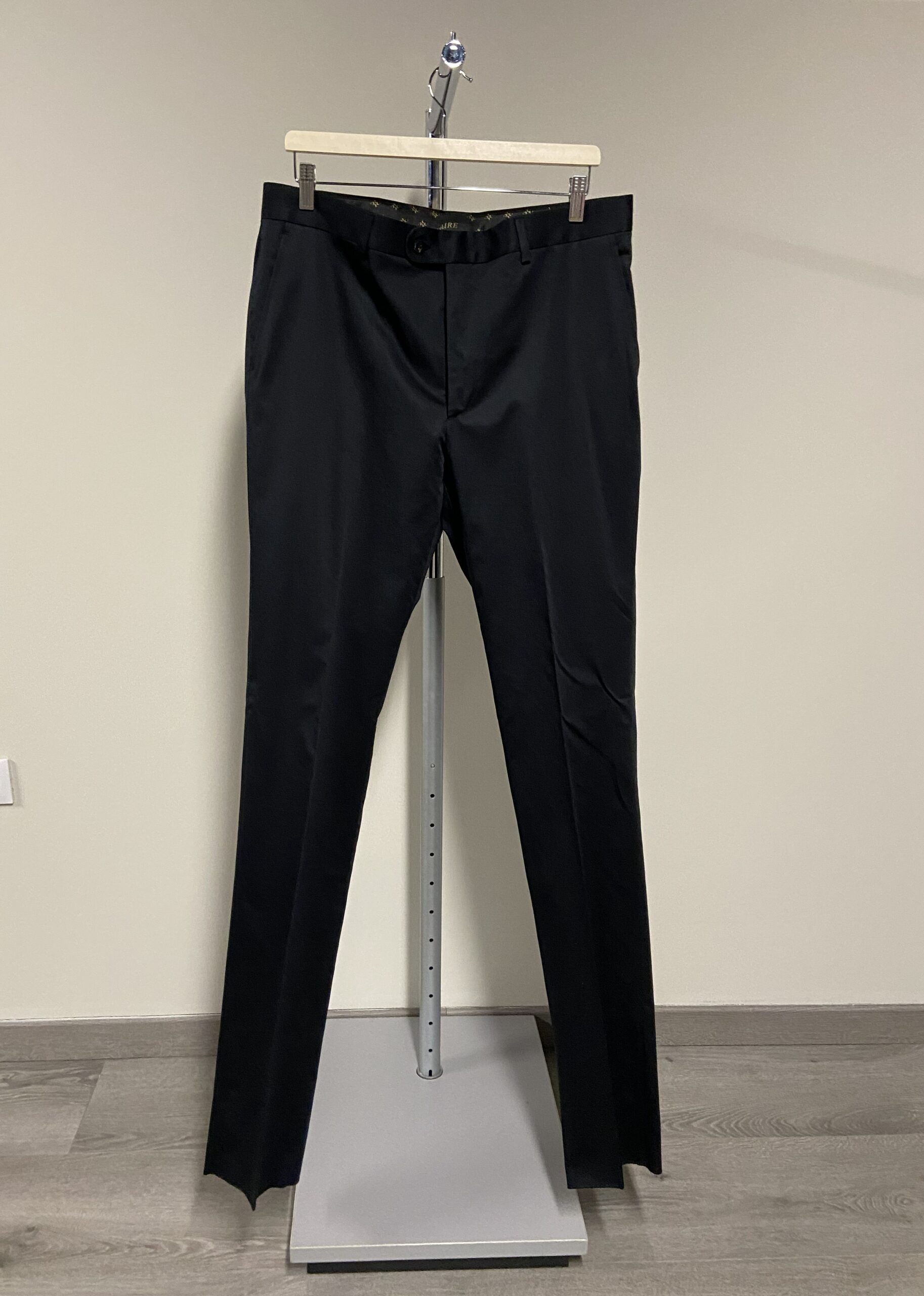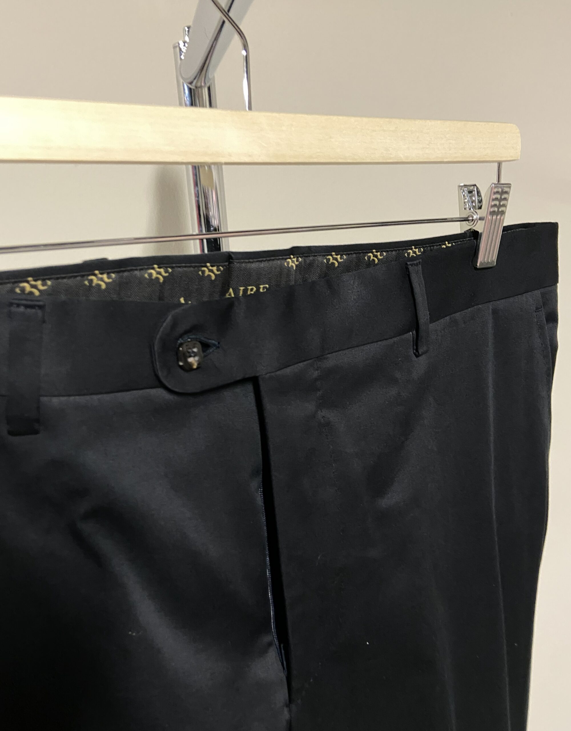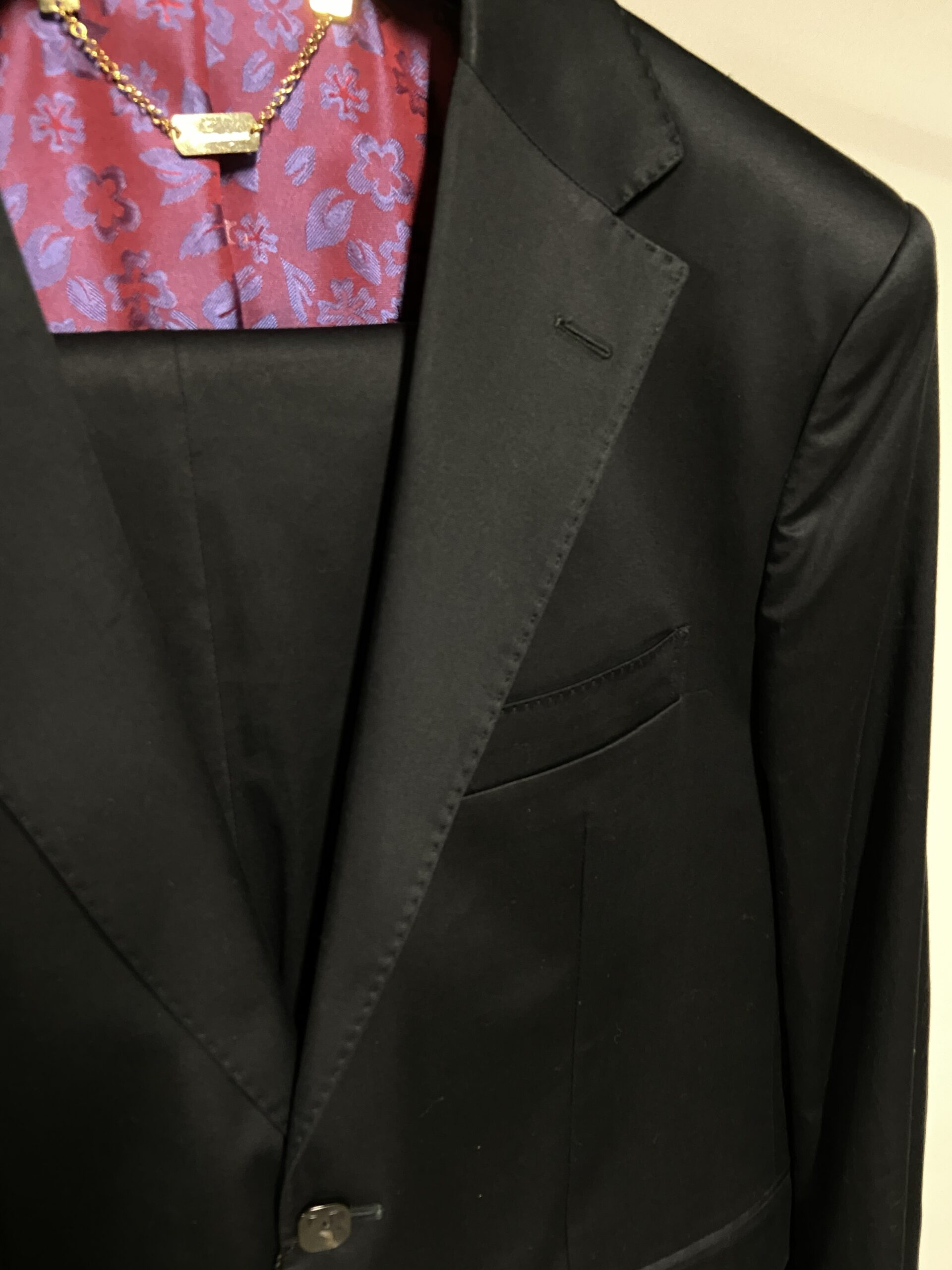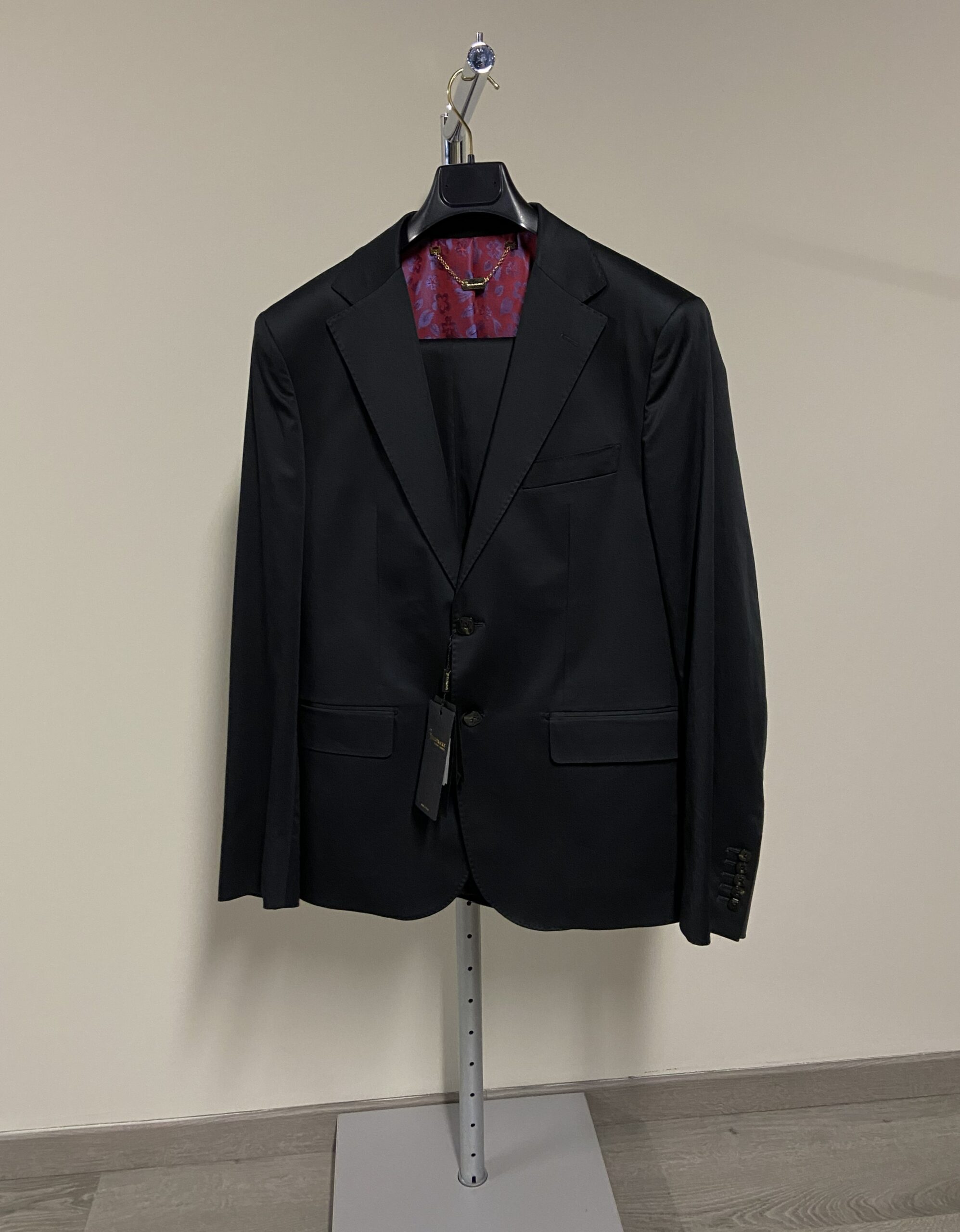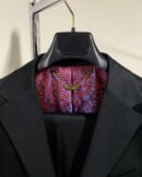 Questo abito è realizzato al 100% in cotone. Presenta un classico design monopetto di colore nero, con revers in raso lucido tipici di un abito da sera. La chiusura frontale presenta due bottoni neri, mentre i polsini sono rifiniti con quattro bottoni impilati. L’elemento distintivo è la vivace fodera interna in tessuto jacquard a fantasia floreale sui toni del viola e del rosso. Include inoltre una catenina decorativa in metallo color oro nel sottocollo.