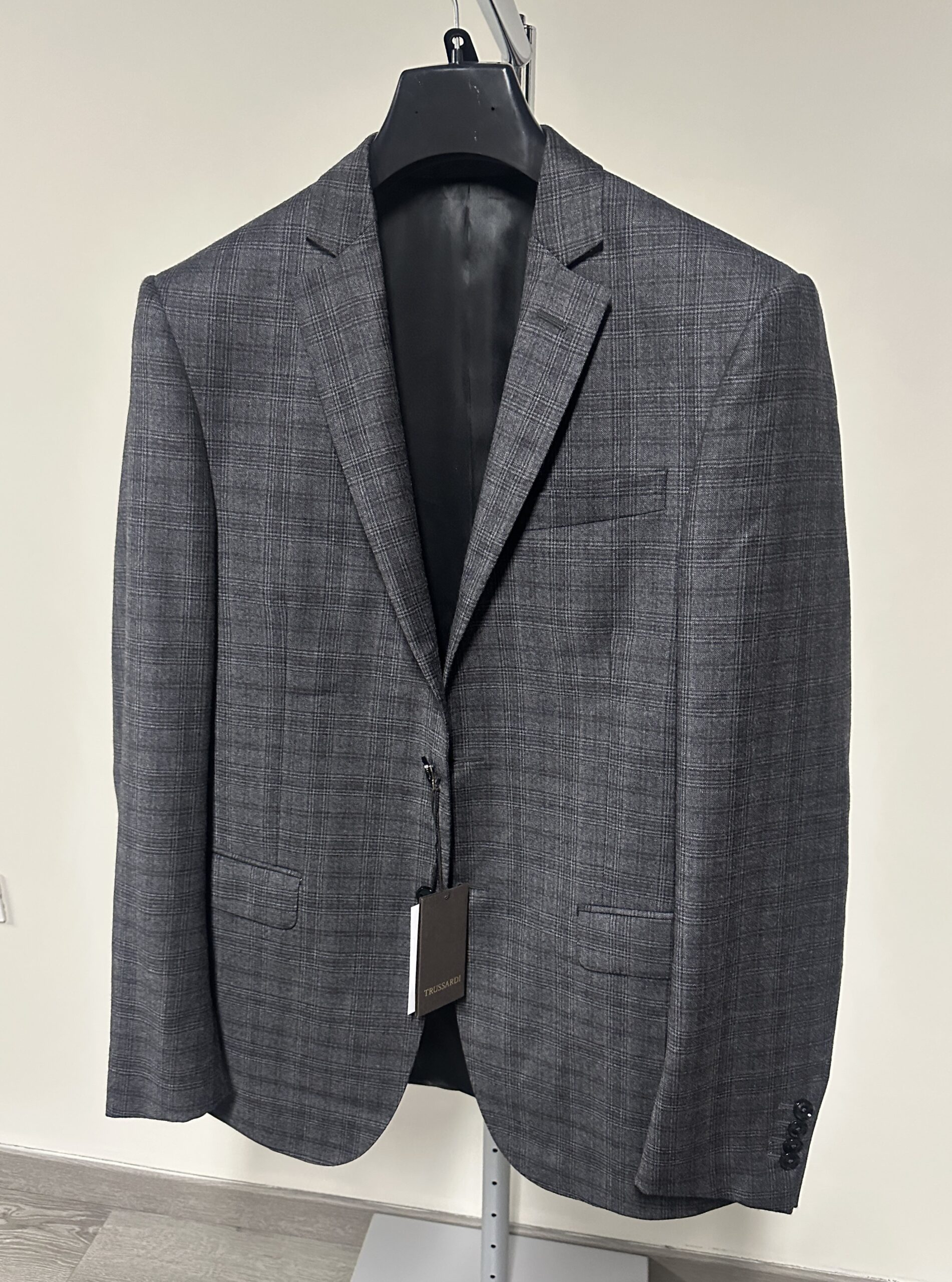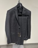 L’abito presenta una giacca monopetto a due bottoni con tasche con pattina e un pantalone abbinato.