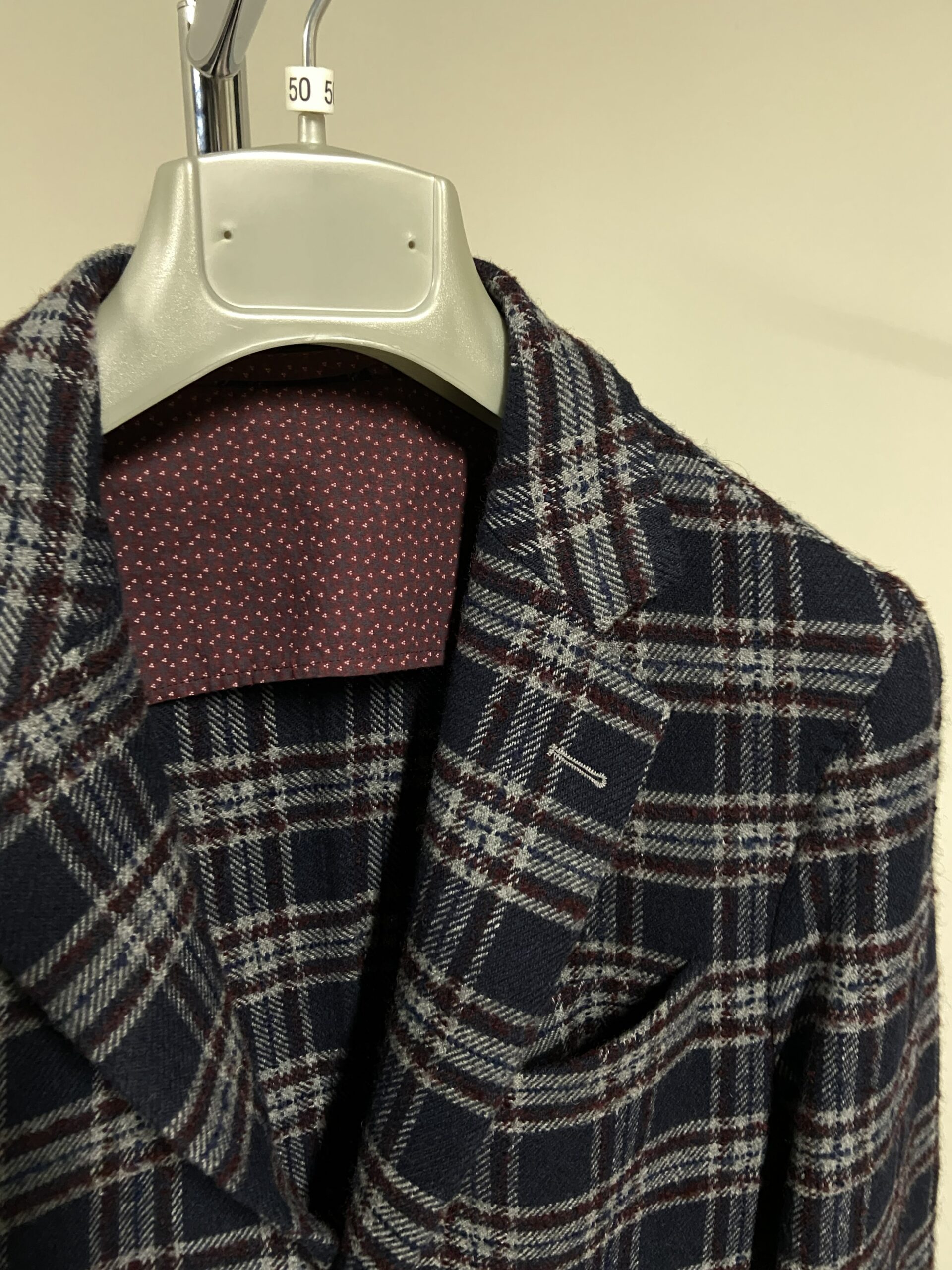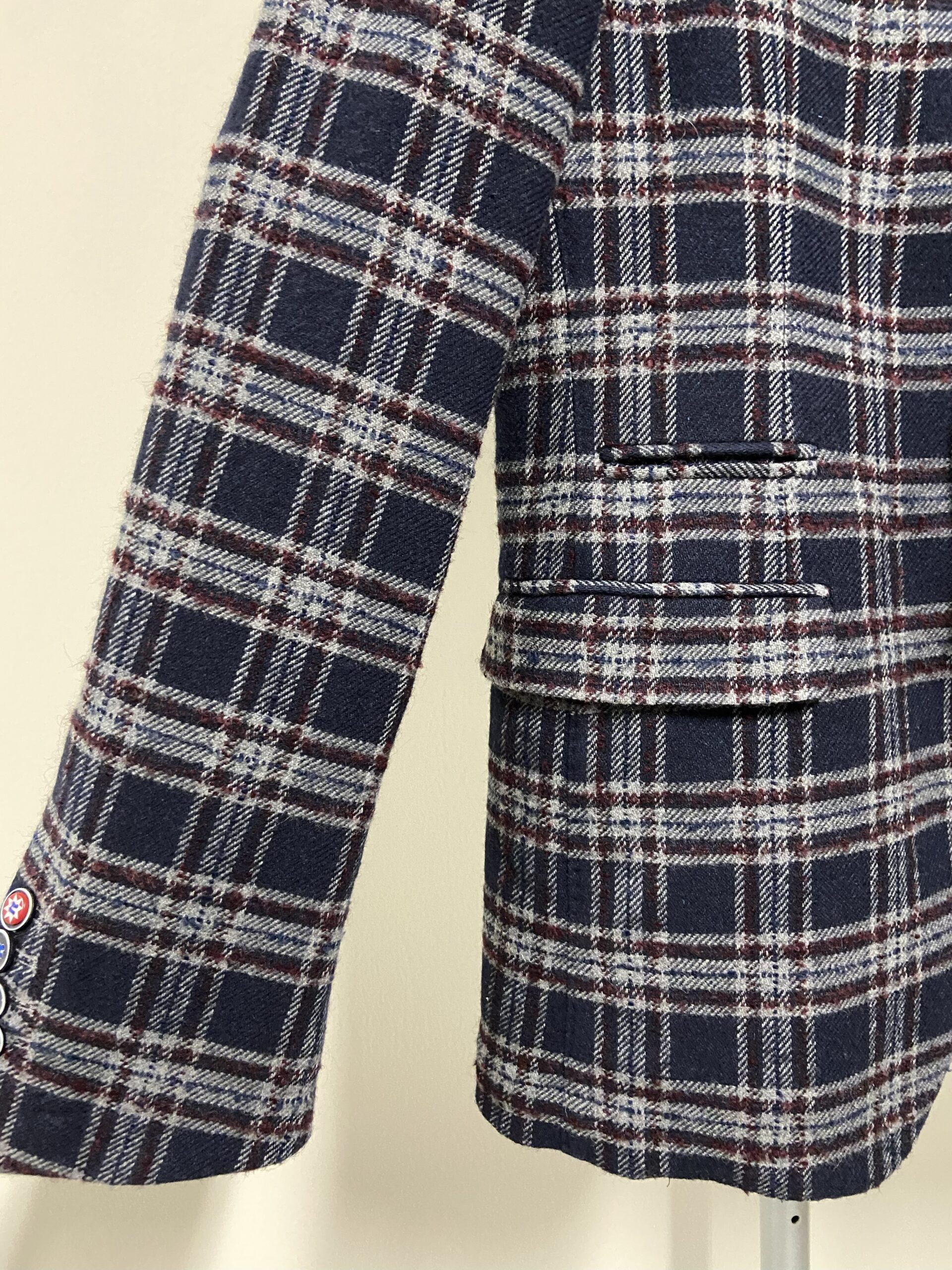 Il tessuto presenta una fantasia a quadri finestrato nei toni del blu navy, bianco e bordeaux su fondo scuro.