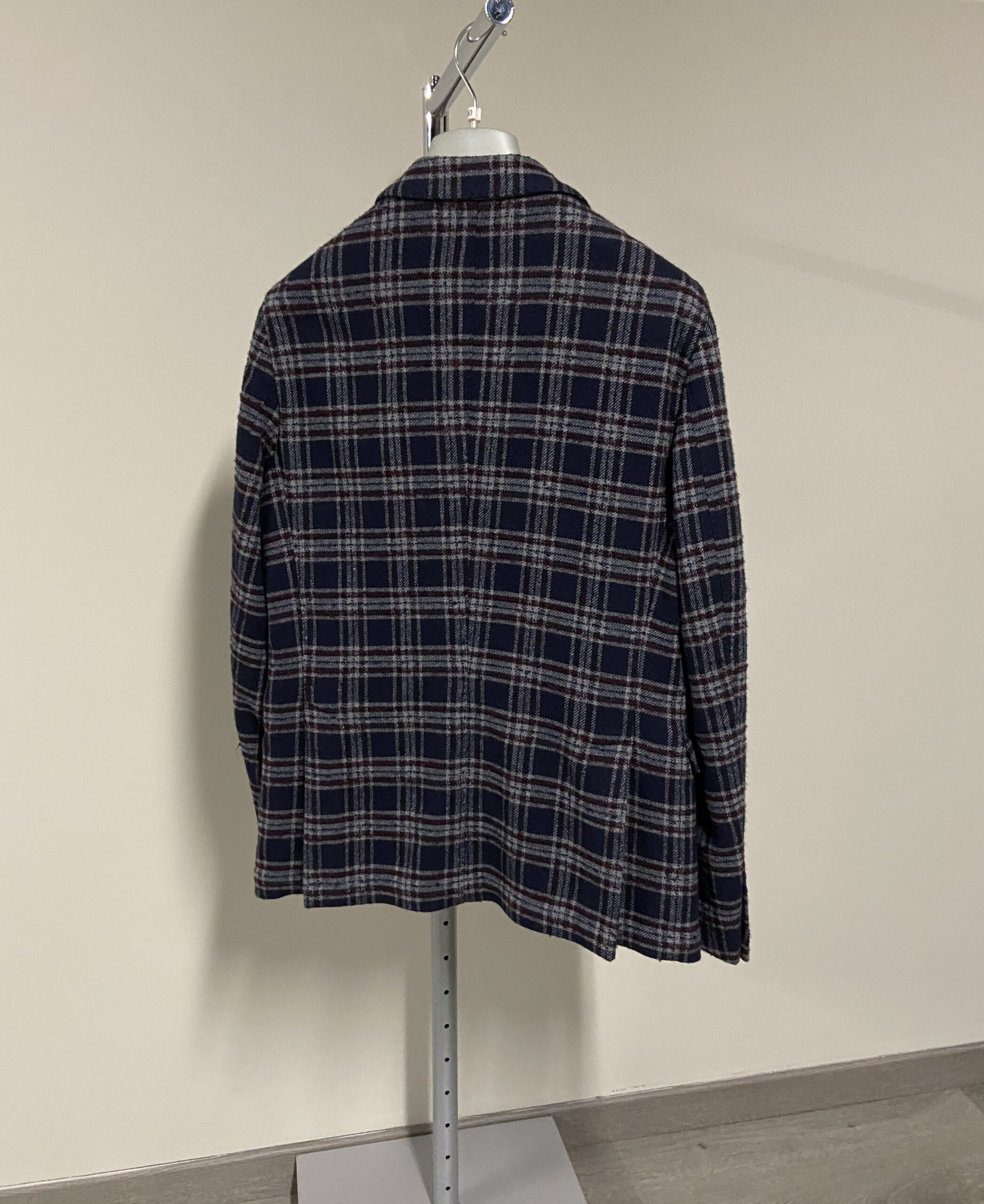 Presenta revers classici, chiusura frontale a due bottoni, due tasche applicate lateralmente e un taschino a filetto sul petto.