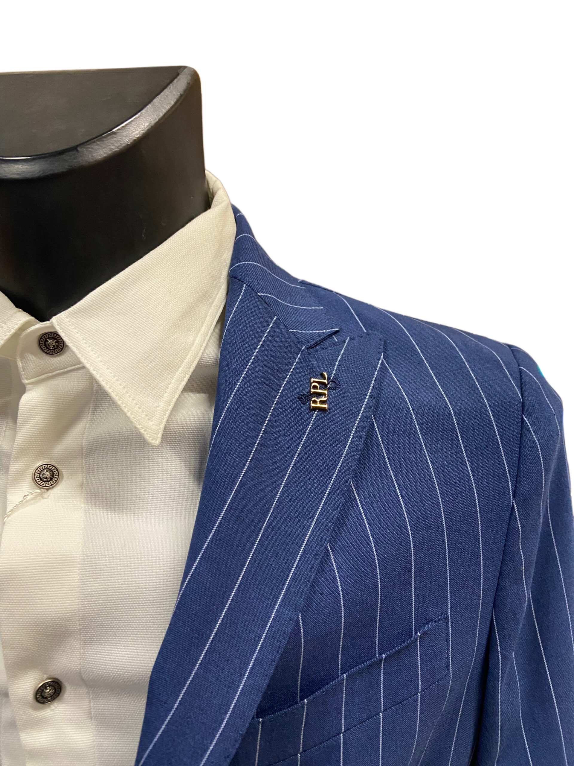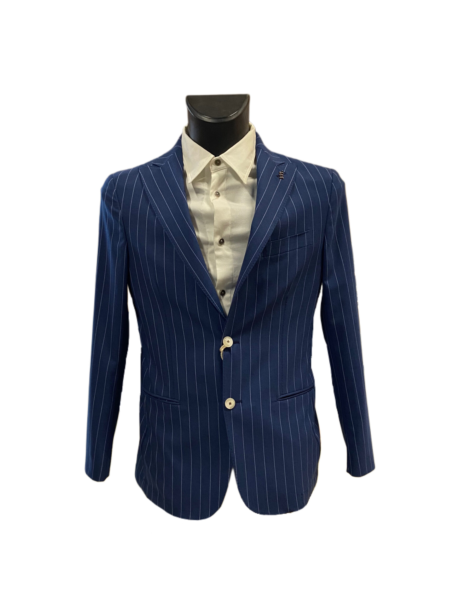 È caratterizzato da uno stile sartoriale con un motivo a righe sottili verticali bianche su uno sfondo blu, identico a quello dei pantaloni abbinati.