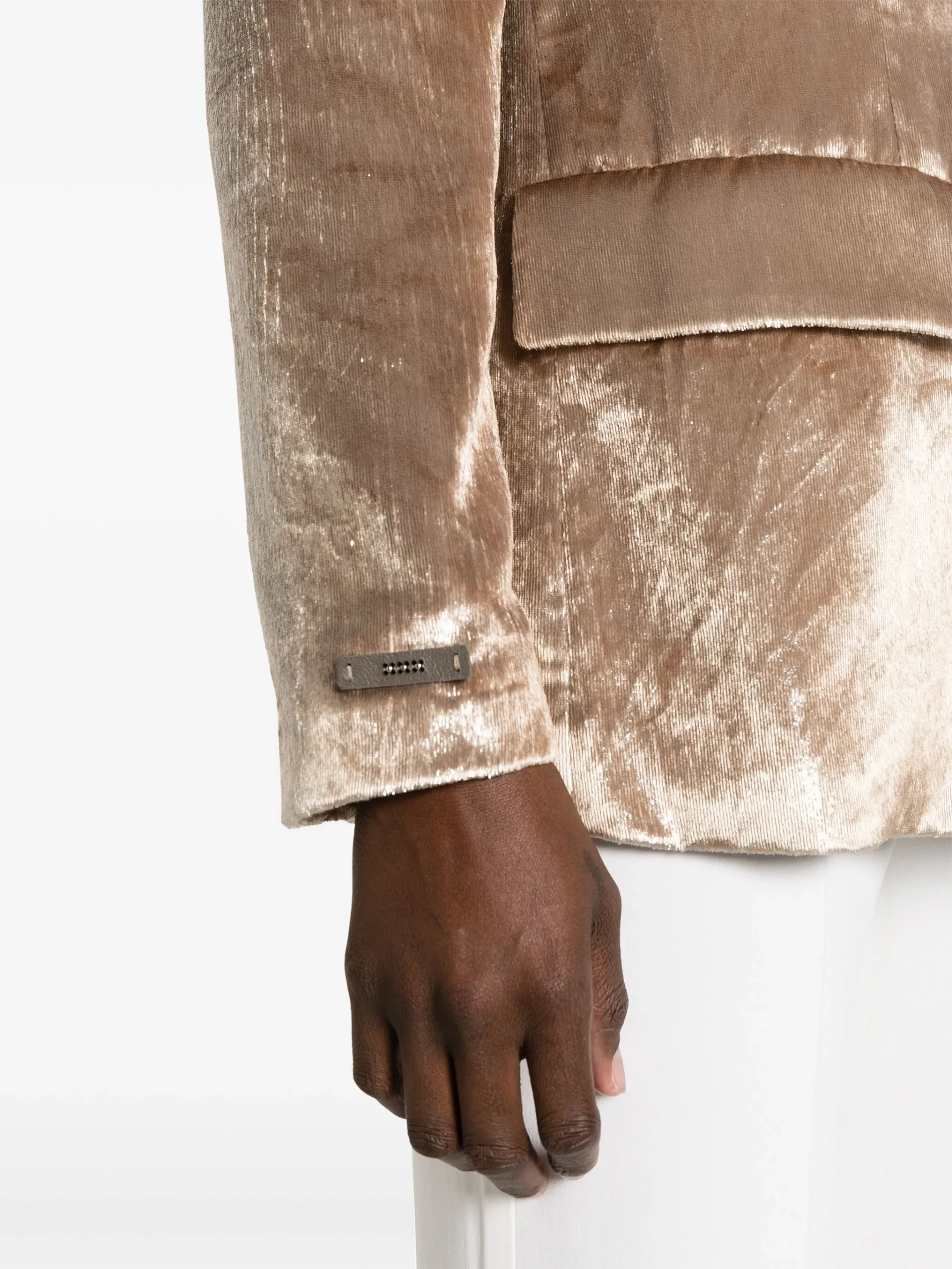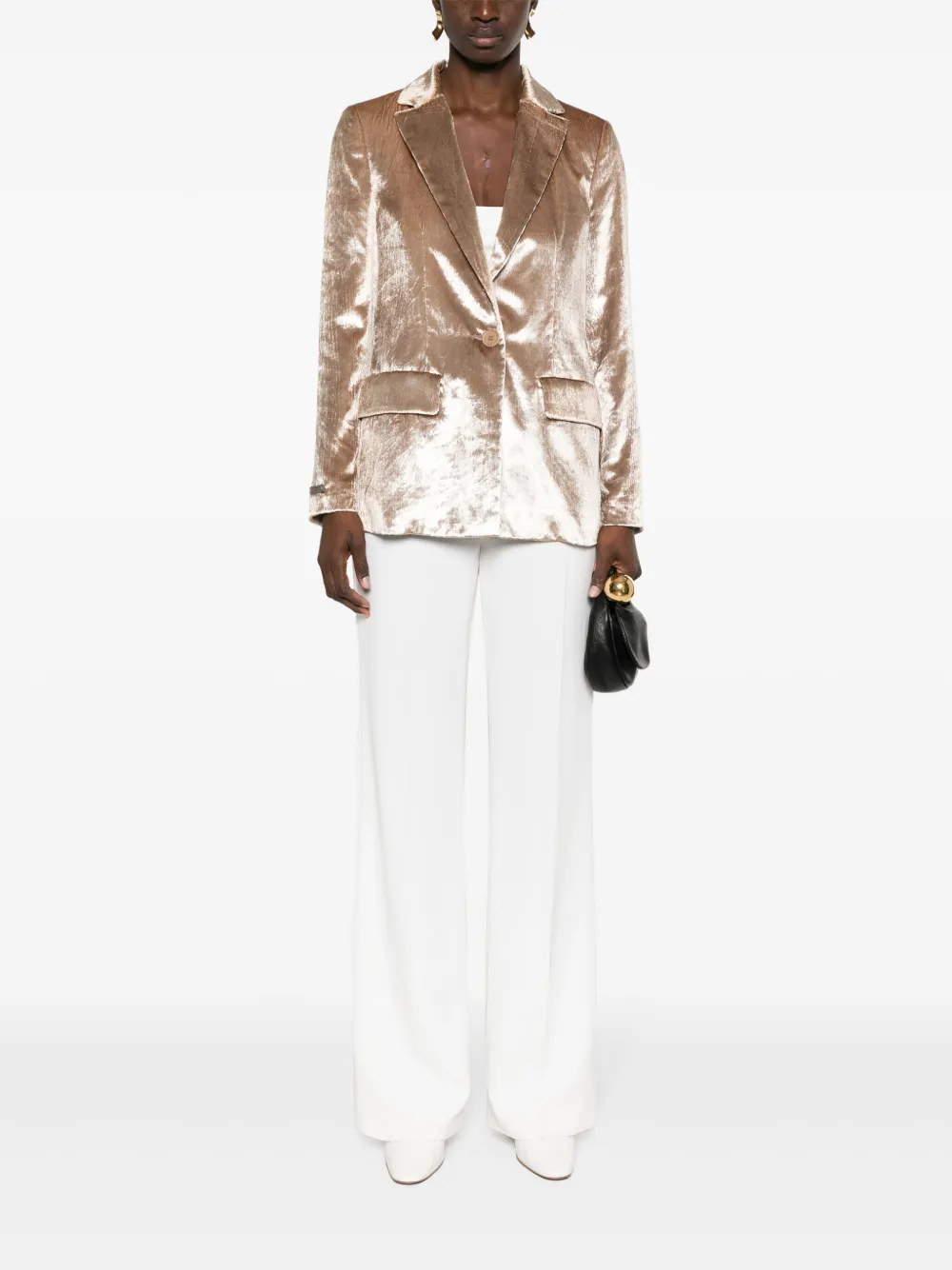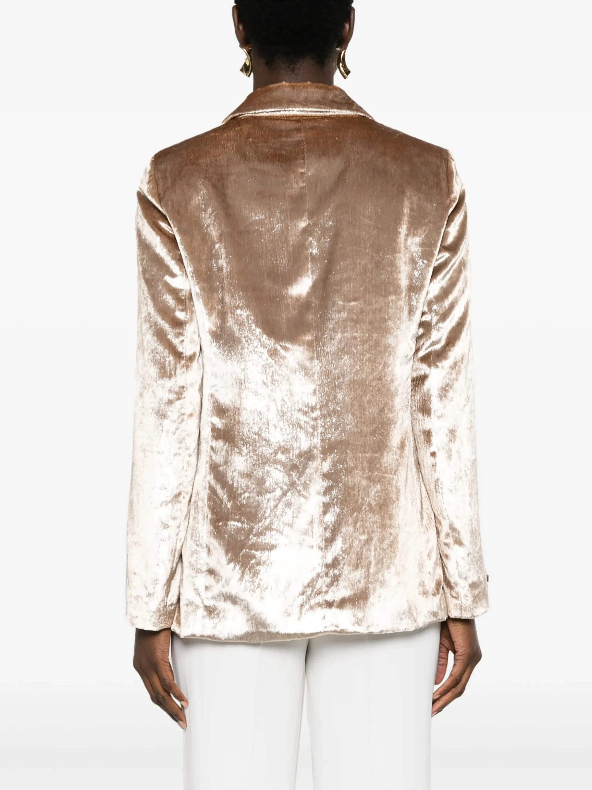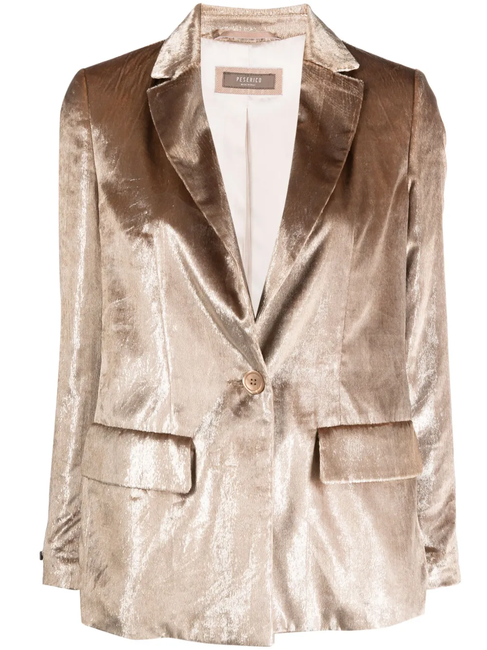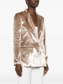 Blazer femminile monopetto, in tonalità oro champagne, caratterizzato da un effetto lucido e brillante dato dai lustrini/lurex integrati nel tessuto.