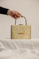 - Dettagli: Presenta pattern trapuntato geometrico su tutta la superficie esterna con manico superiore rigido e tondo in metallo con finitura galvanizzata color oro lucido. Logotipo frontale “Love Moschino” in metallo applicato. Sistema di chiusura superiore con cerniera metallica.