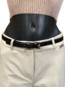 Il design presenta una fibbia rettangolare ad ardiglione in metallo color oro lucido e un passante in pelle abbinato.