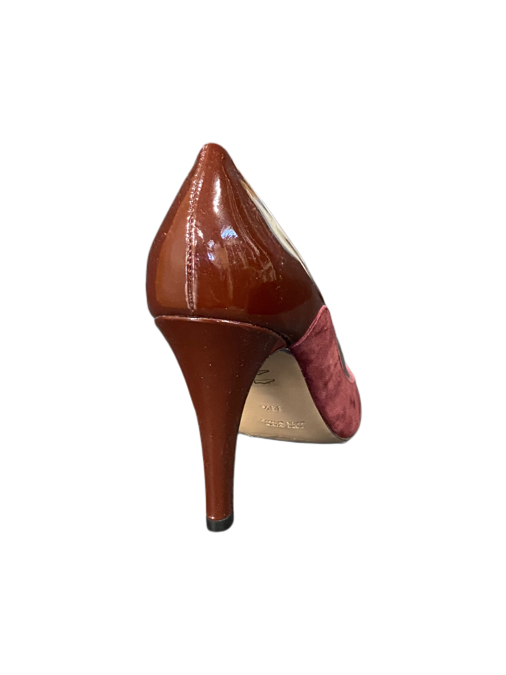 Il modello si distingue per l’uso di due diverse finiture di vera pelle 100%: la parte anteriore e il corpo principale della scarpa sono in morbida pelle scamosciata color bordeaux, mentre il tacco, il controtacco e il bordo superiore sono in pelle verniciata lucida in una tonalità abbinata.