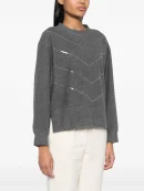 La caratteristica principale è il motivo decorativo a V realizzato con impunture argentate a contrasto sul pannello frontale.