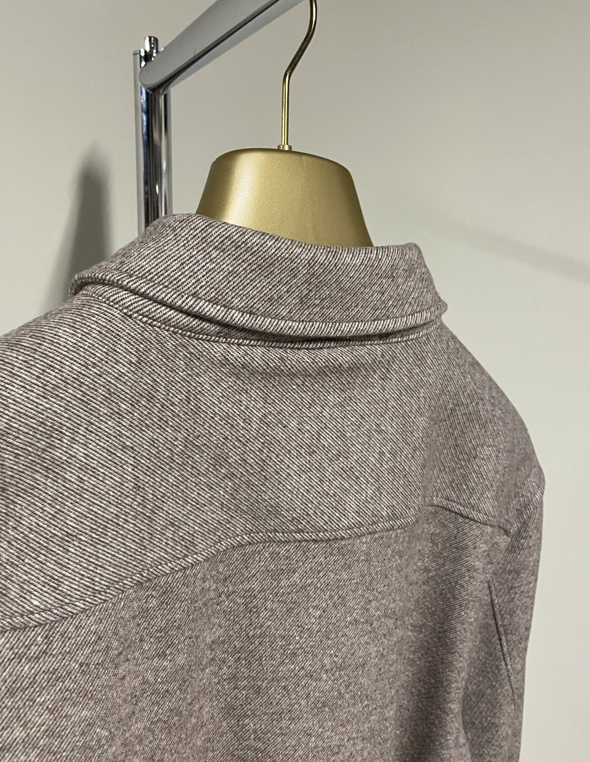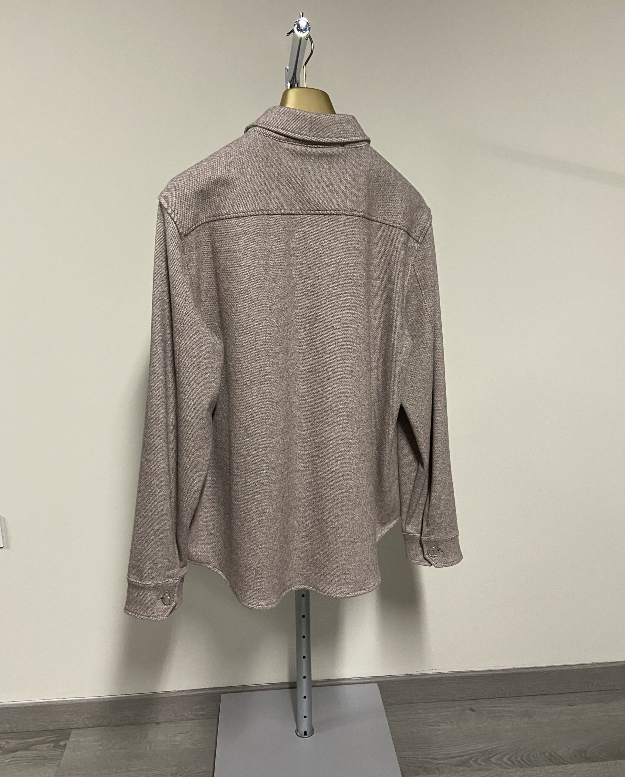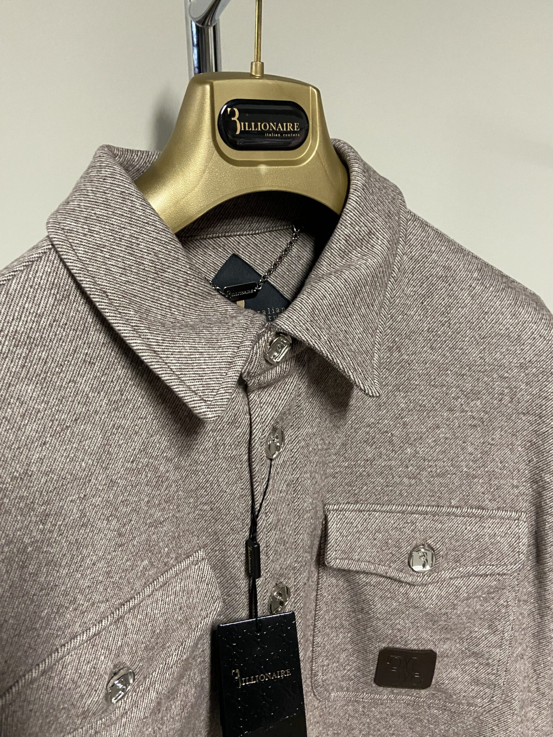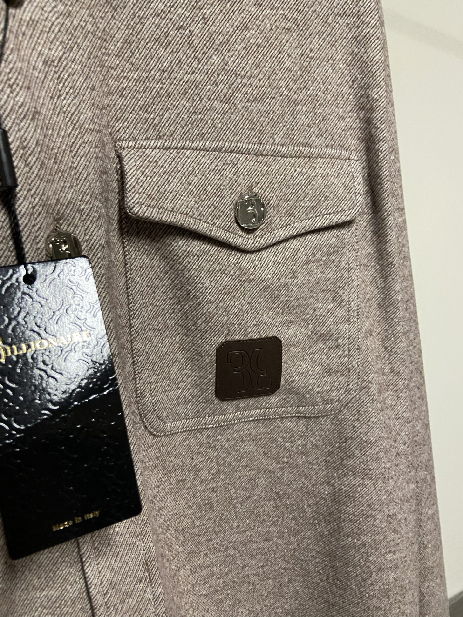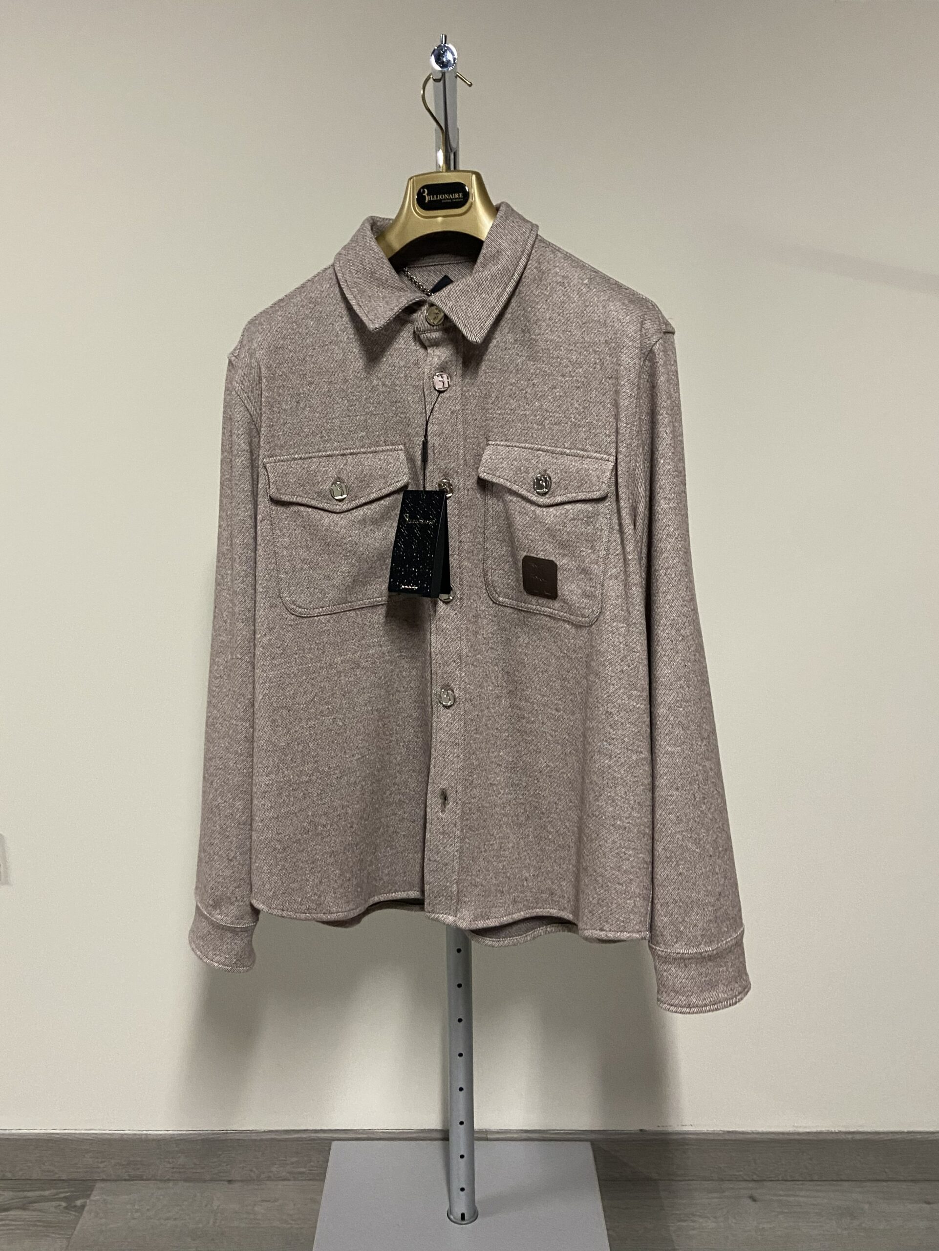 Il design presenta un taglio dritto, maniche lunghe, un colletto classico, e una chiusura frontale con bottoni. È dotata di due tasche sul petto con chiusura a bottone. Sulla tasca destra è applicata una patch in pelle marrone con logo in rilievo, e i bottoni sono in metallo argentato con un disegno in rilievo che riflette l’identità del brand. Prodotto in Italia.