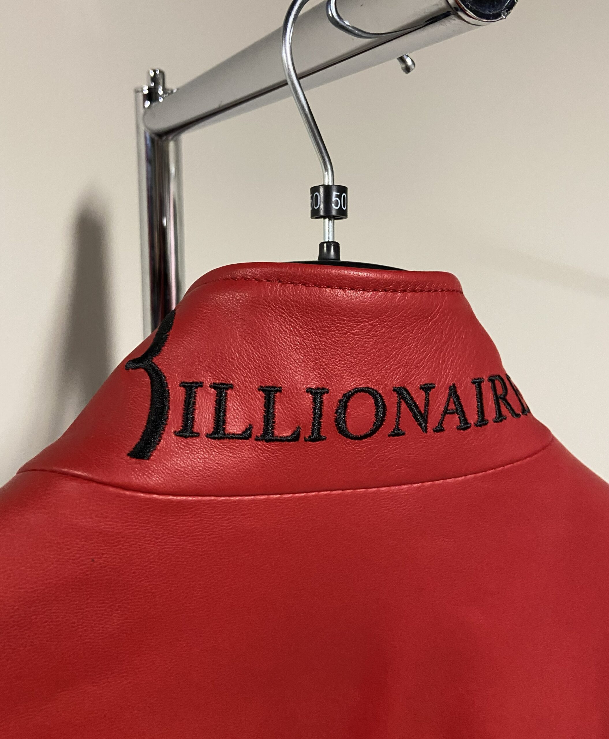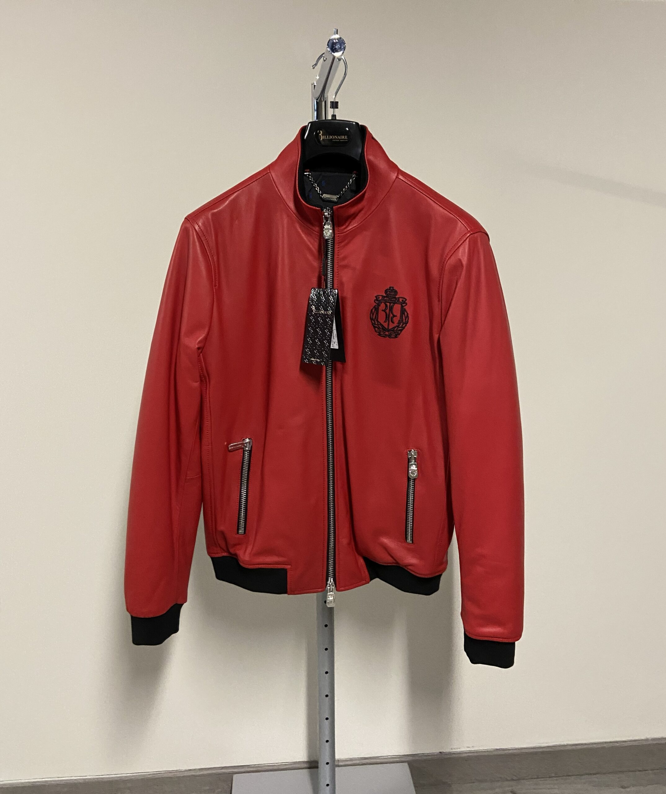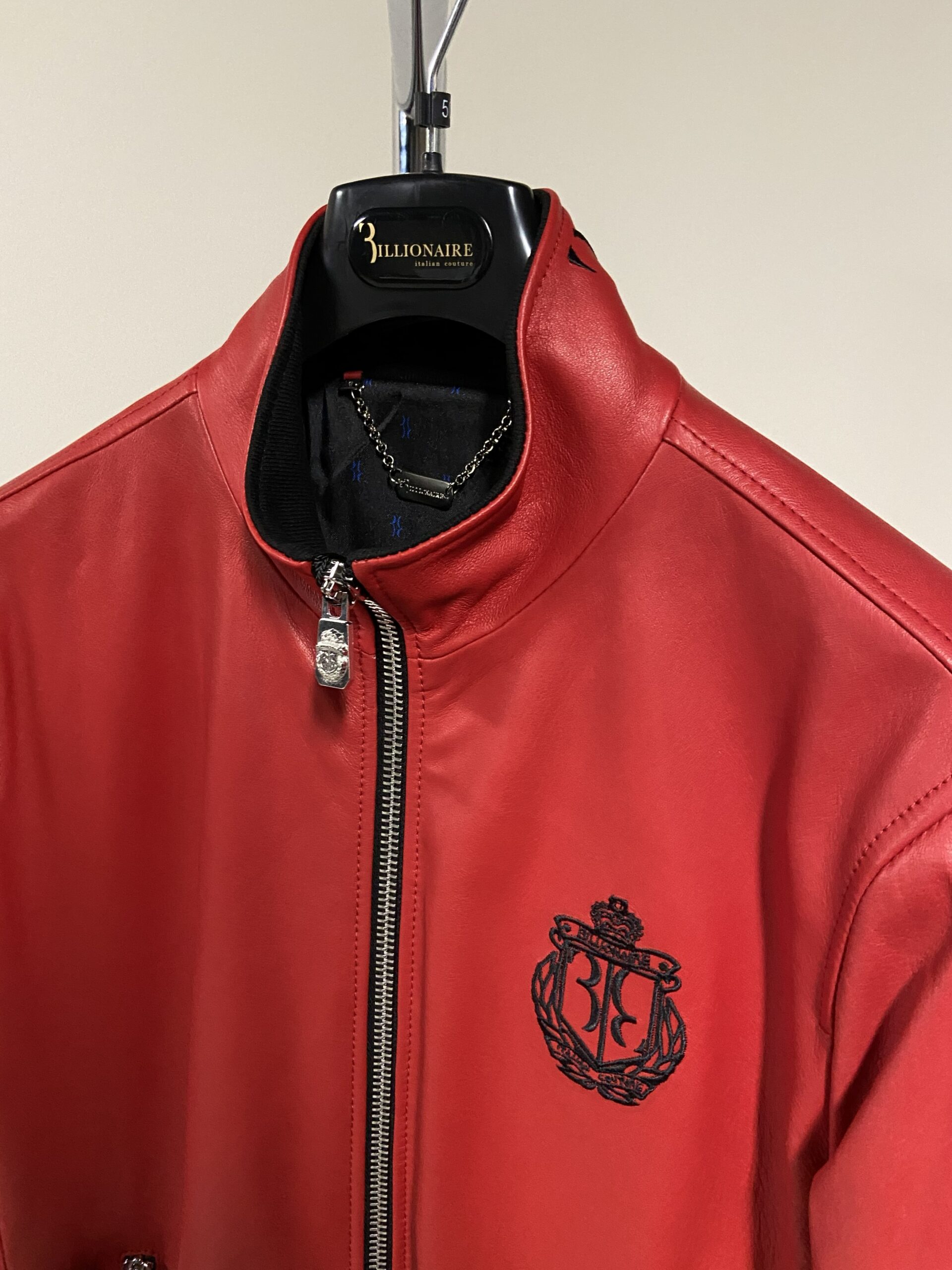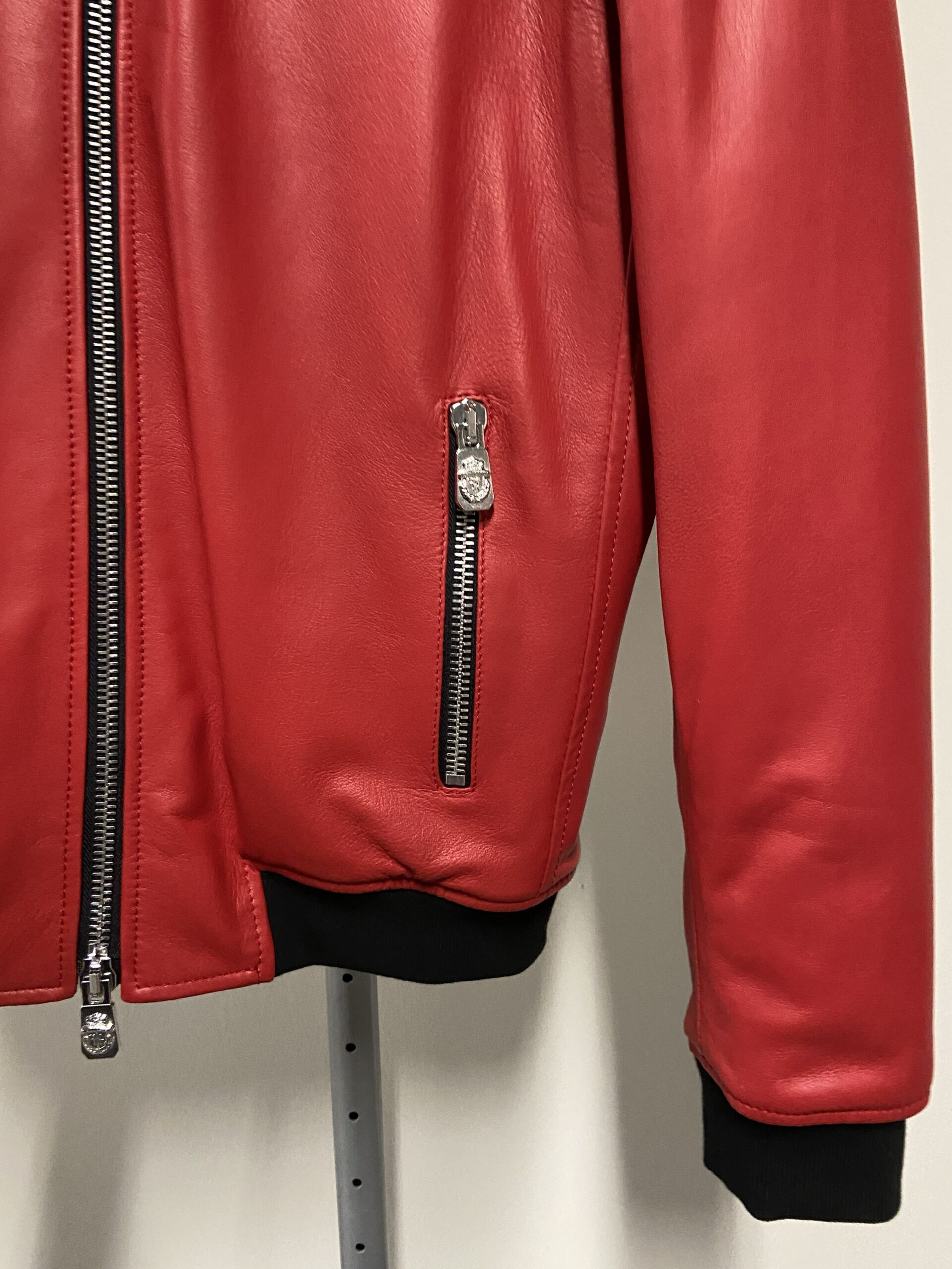 È realizzato in morbida e lucida pelle di agnello (100% pelle) di un vivace colore rosso. Il design include un colletto, polsini e orlo inferiore a costine in maglia elasticizzata nera a contrasto, e una chiusura frontale con cerniera argentata. I dettagli distintivi includono una placca con logo in metallo argentato e una scritta loggata sul retro del colletto.