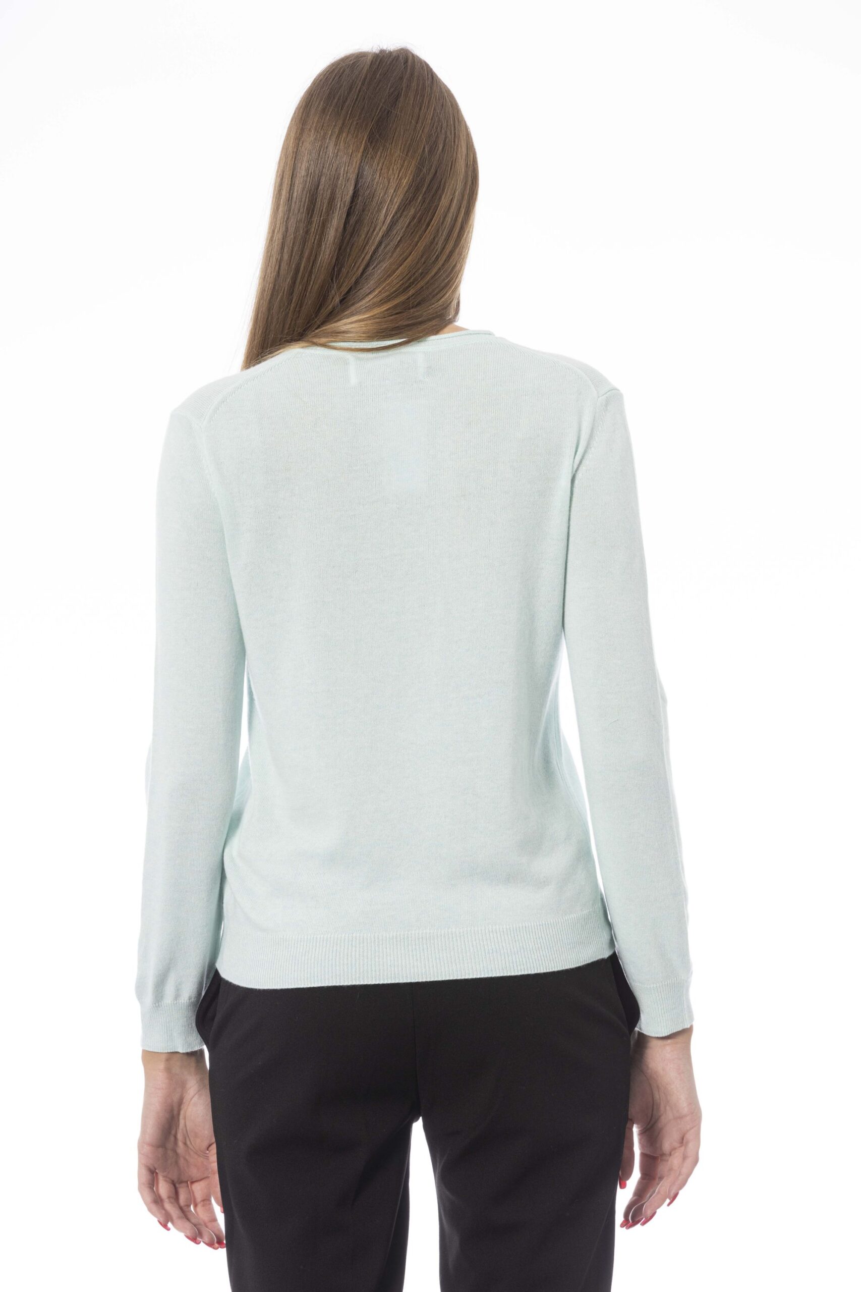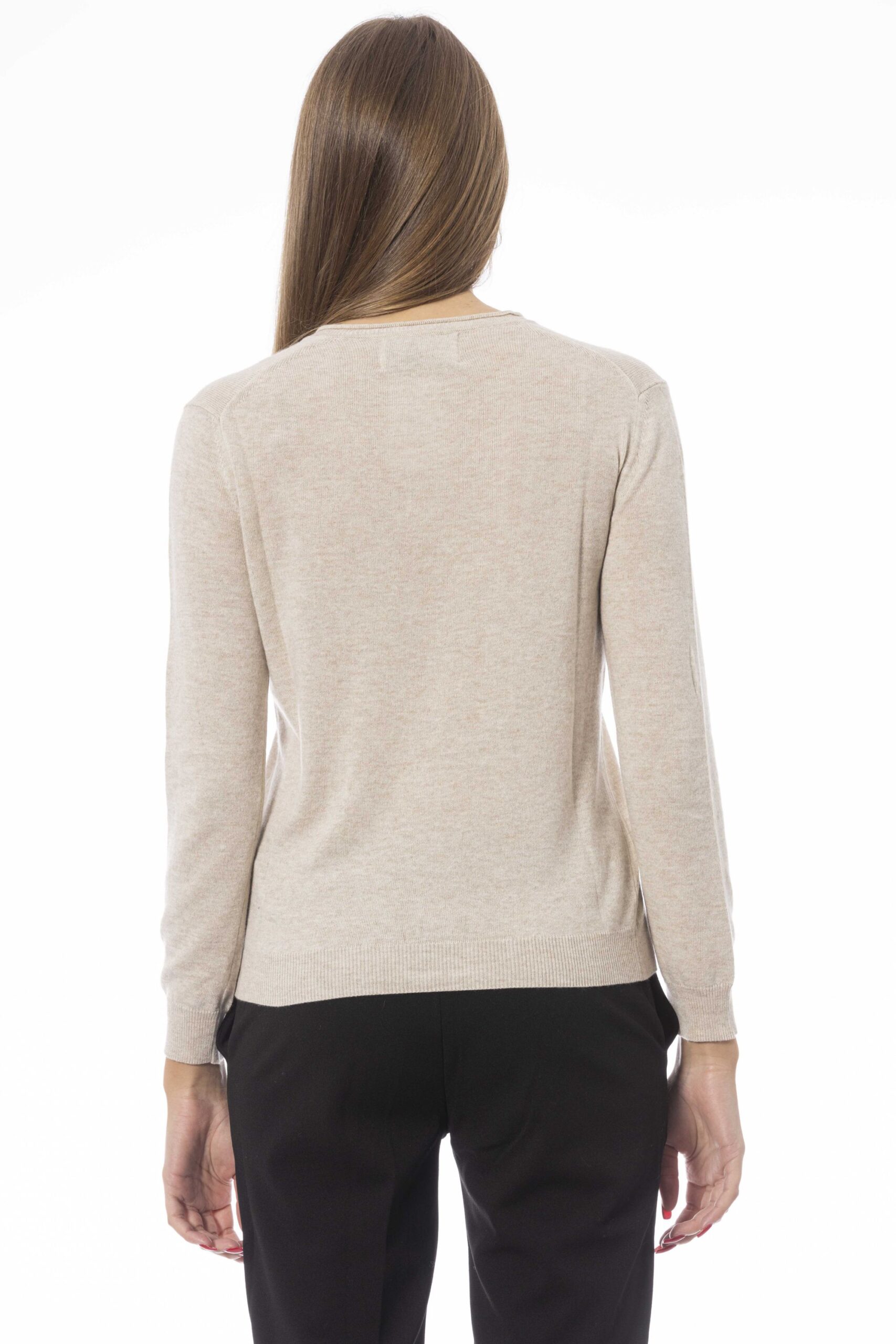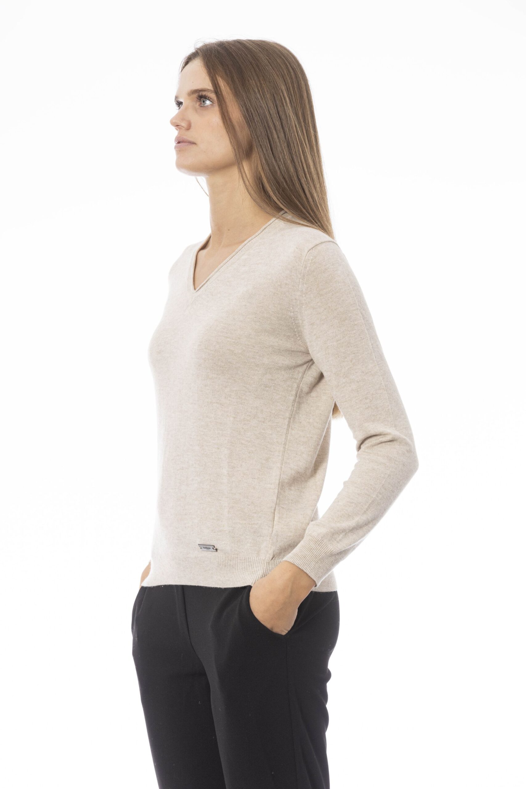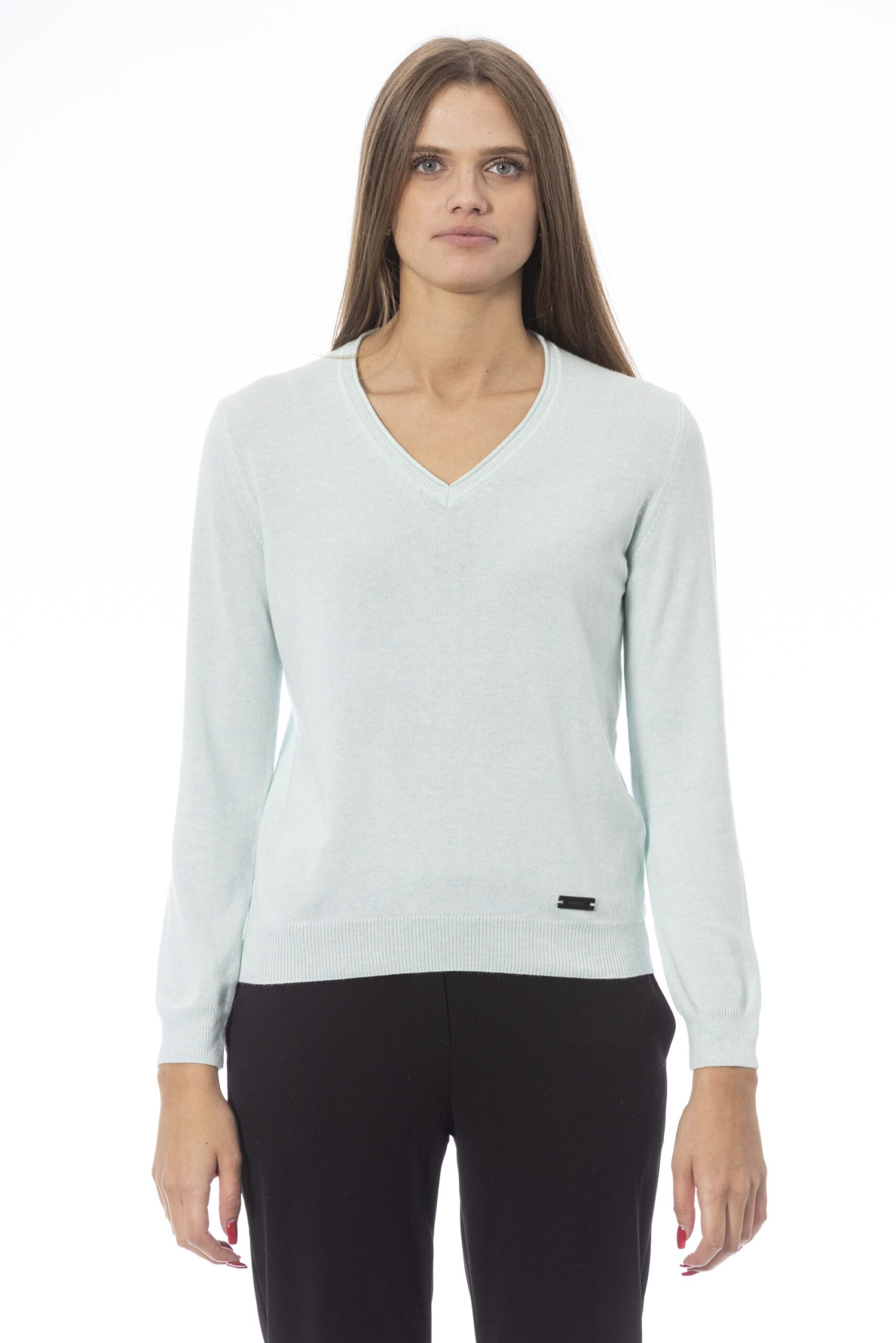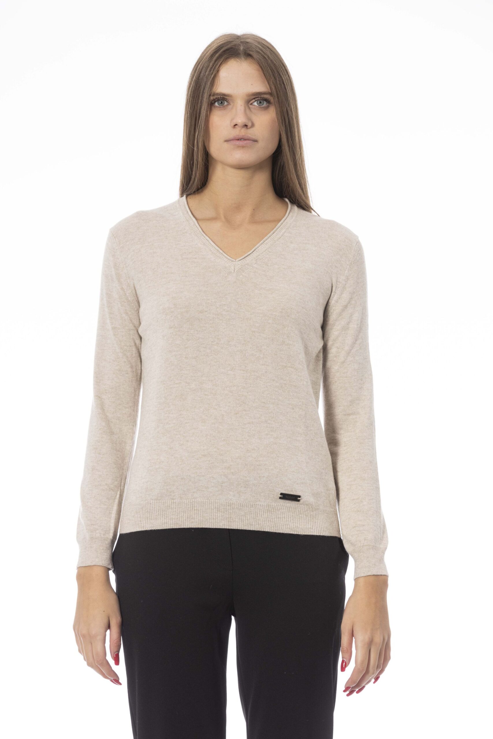 Maglia da donna Baldinini con scollo a V, maniche lunghe, tinta unita con un piccolo logo visibile in basso a sinistra.