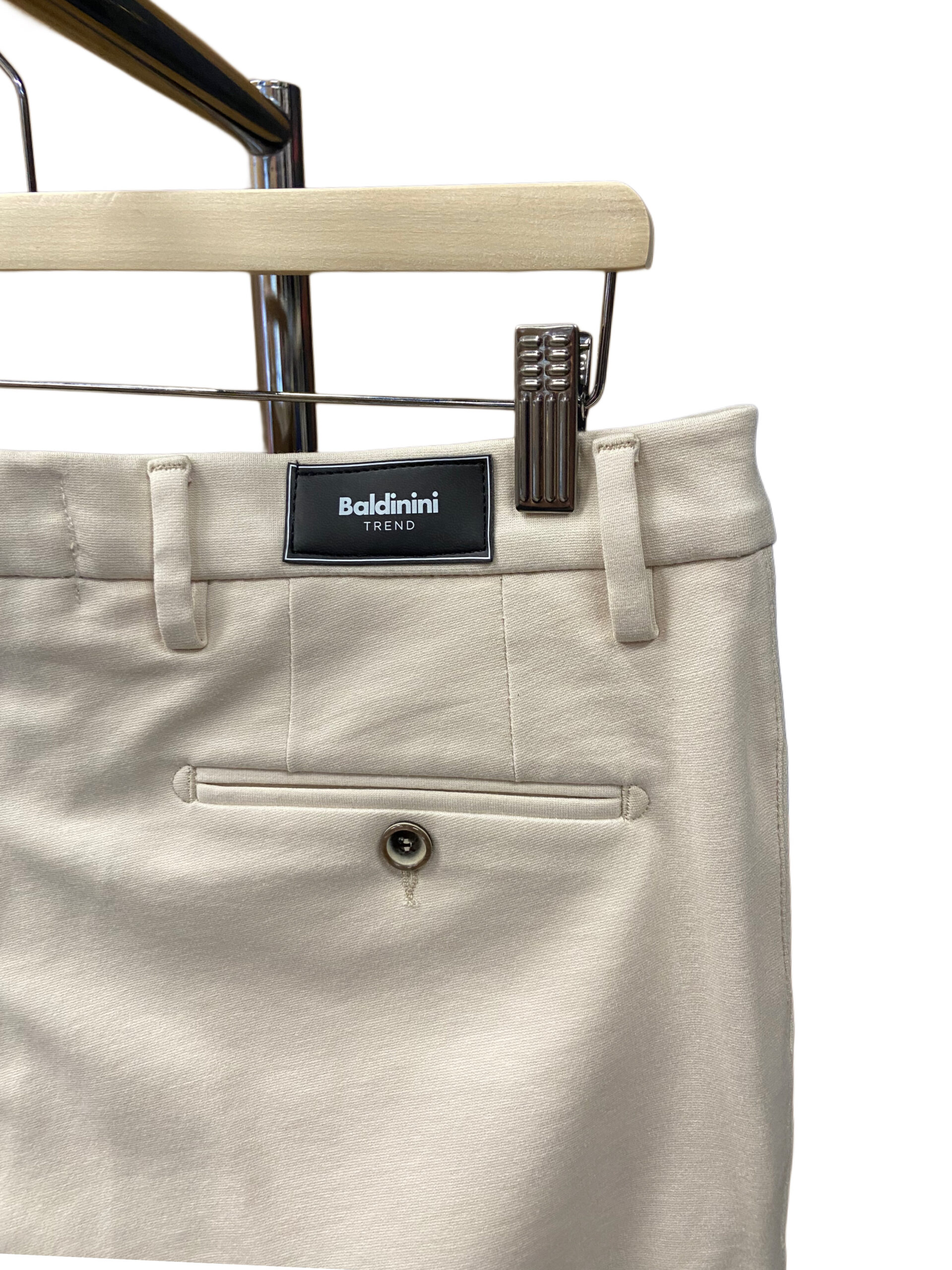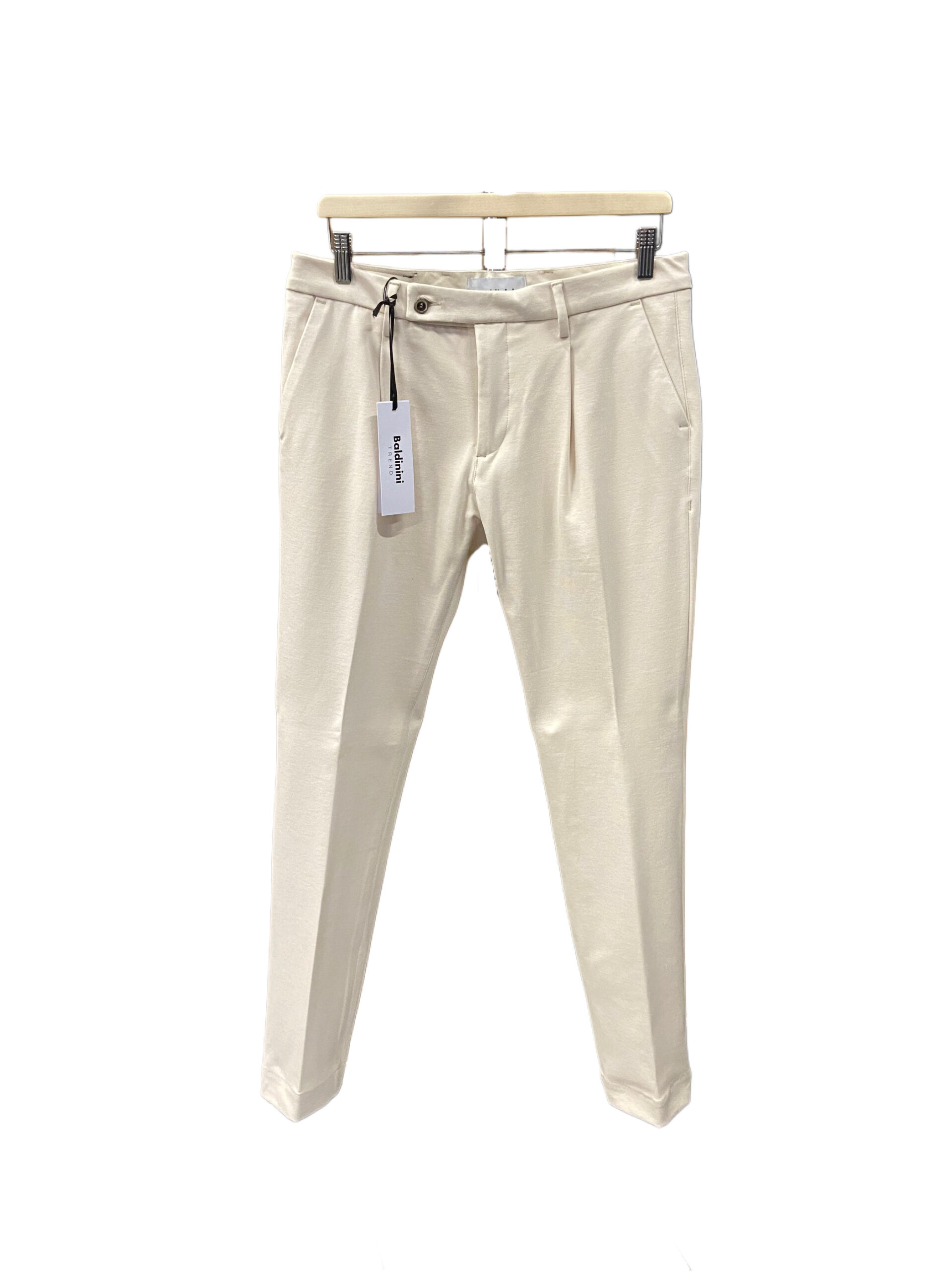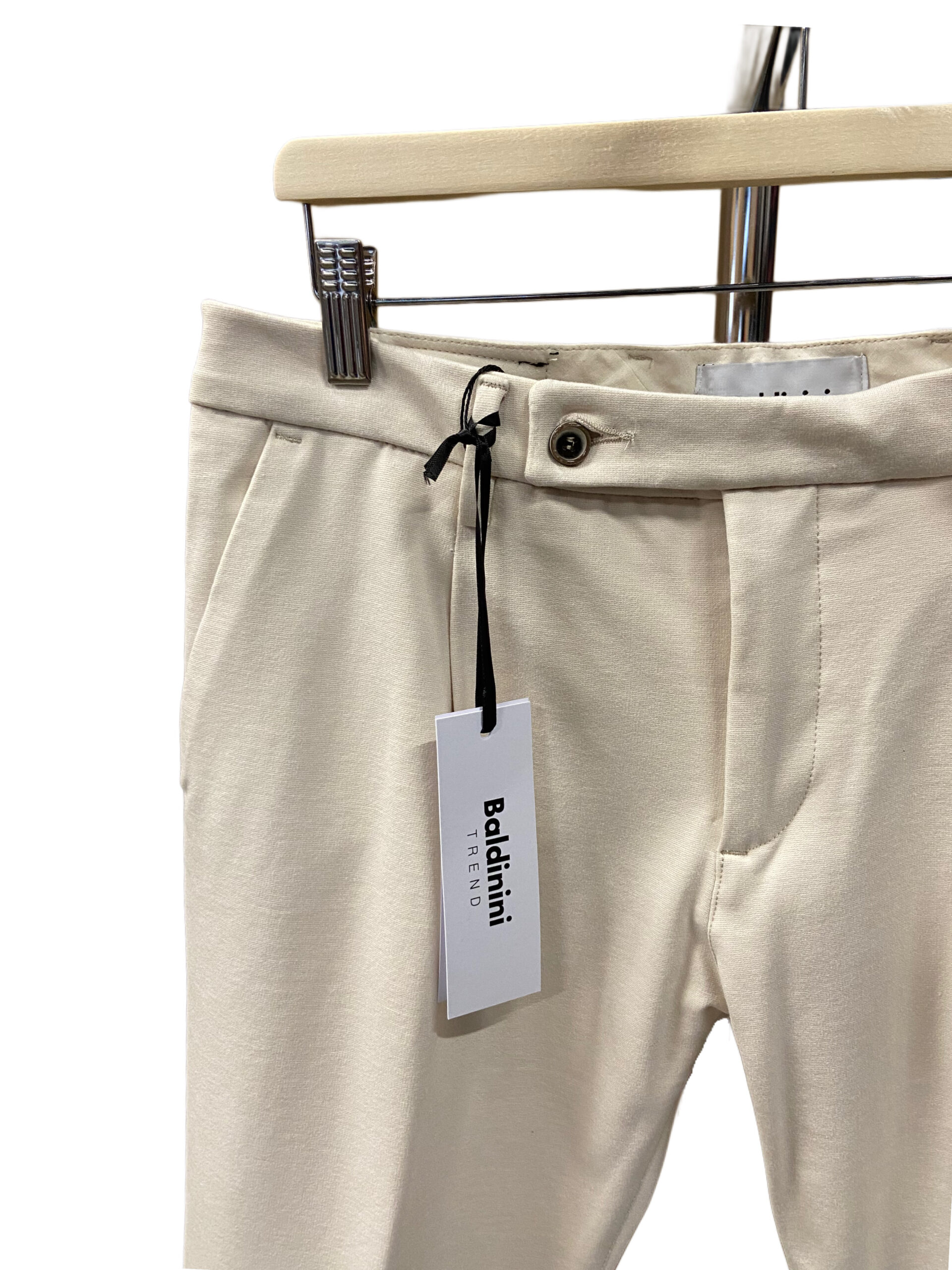 Il modello presenta una vita media con passanti per cintura, chiusura frontale con cerniera e bottone, due tasche laterali oblique e due tasche a filetto sul retro con chiusura a bottone.