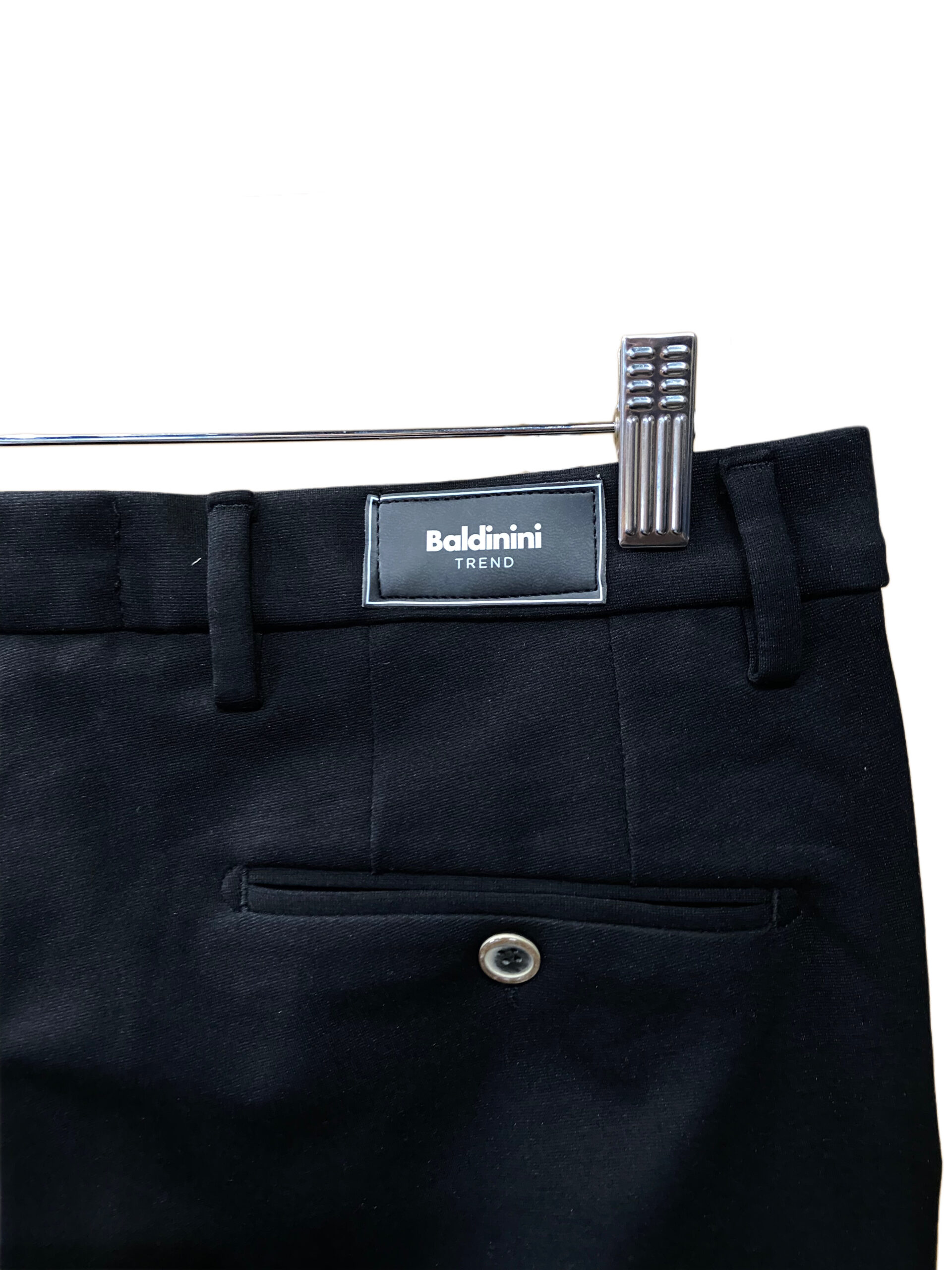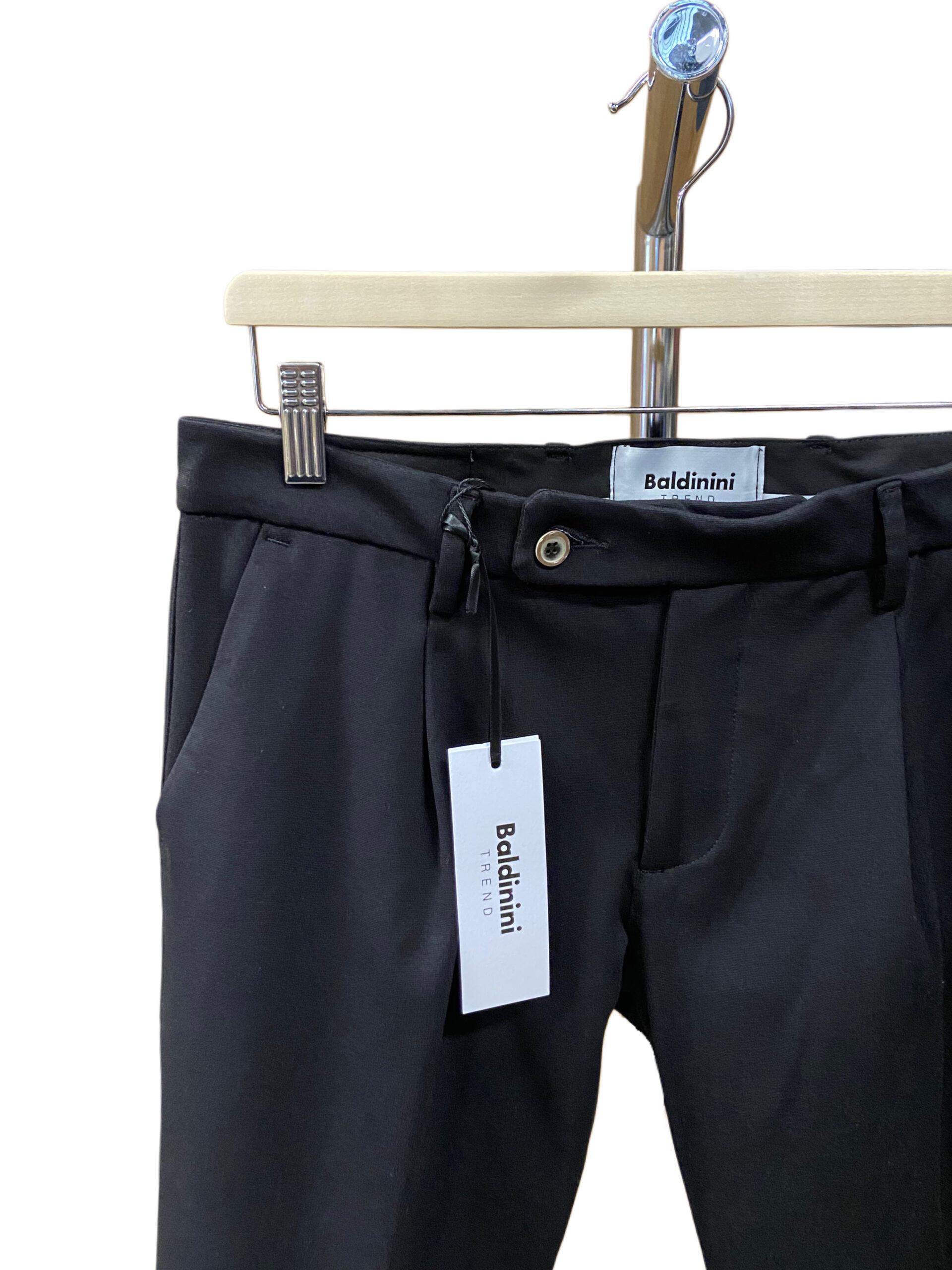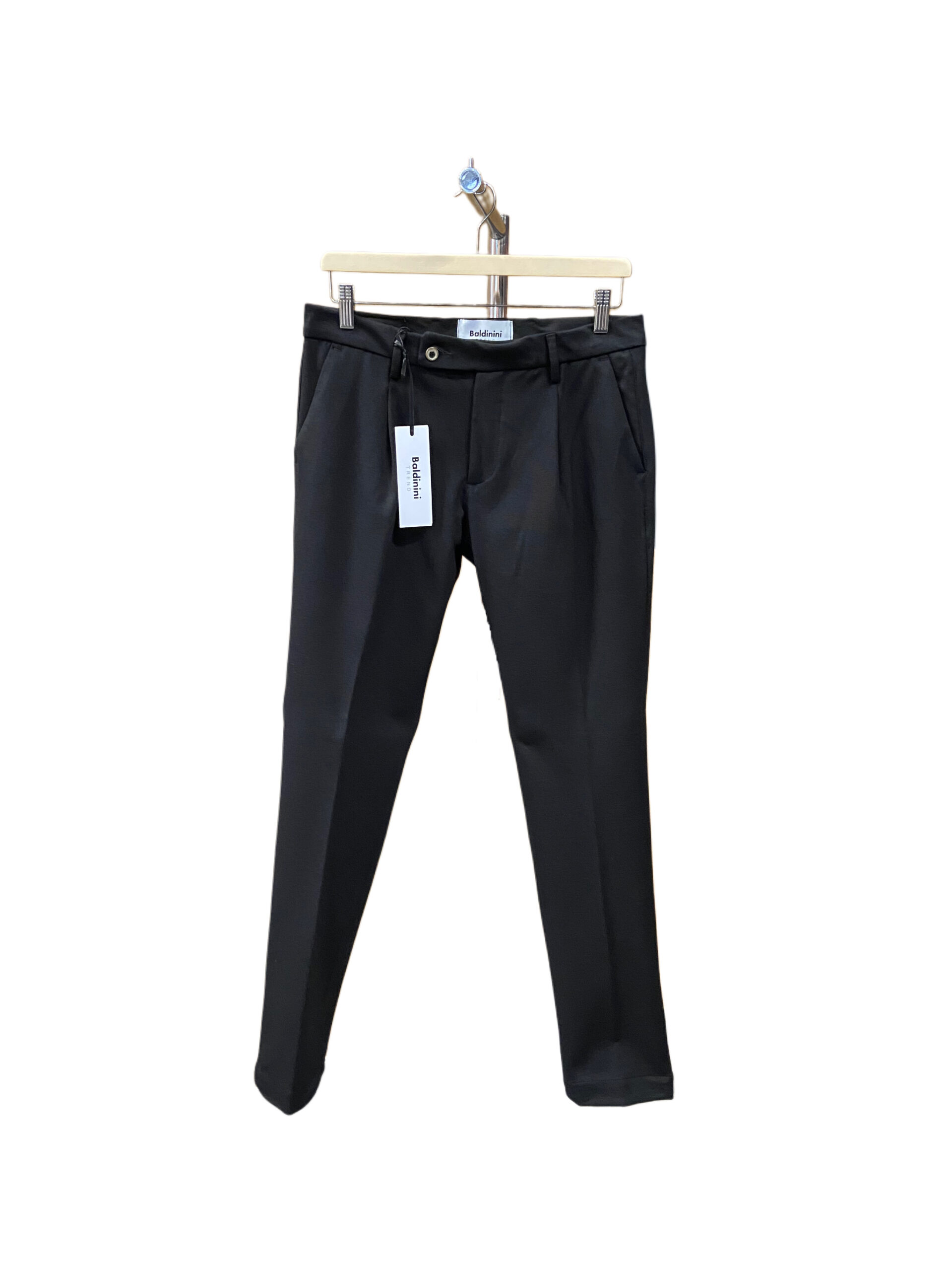 Il modello presenta una vita media con passanti per cintura, chiusura frontale con cerniera e bottone, due tasche laterali oblique e due tasche a filetto sul retro con chiusura a bottone.