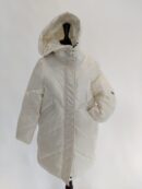 - Dettagli: Il capo presenta una trapuntatura orizzontale su tutta la superficie. È dotato di un collo alto e un ampio cappuccio. La chiusura frontale è gestita da una cerniera zip a doppio cursore. Include tasche laterali.
