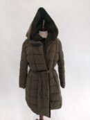 - Dettagli: Il capo presenta una trapuntatura a blocchi su tutta la superficie. È dotato di un ampio collo sciallato che funge da cappuccio. La chiusura anteriore è gestita da una cintura in tessuto tono su tono annodabile in vita. Include tasche laterali a filo.