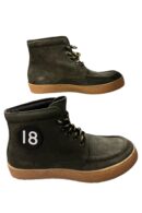 Scarpe stringate da uomo di Cerruti 1881. Realizzate al 100% in pelle bovina con finitura in camoscio verde oliva. Presentano un design con dettagli traforati in stile inglese (brogue). Sono dotate di una spessa suola a carrarmato in gomma nera, che offre aderenza e stabilità. Prodotte in Italia.