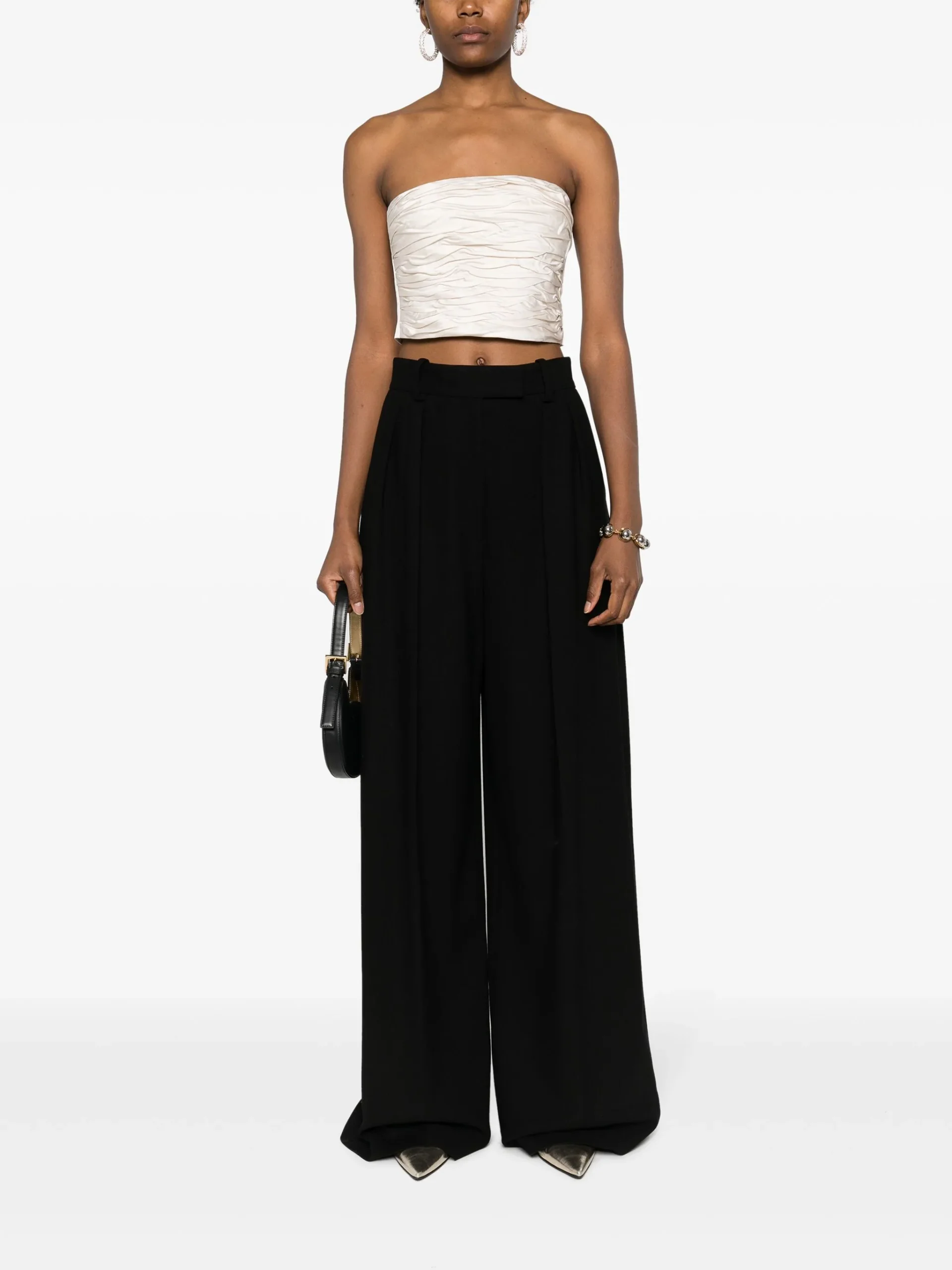 L’elemento distintivo del design è l’ampia arricciatura orizzontale su tutta la superficie del capo, che crea un effetto stropicciato e dimensionale.
