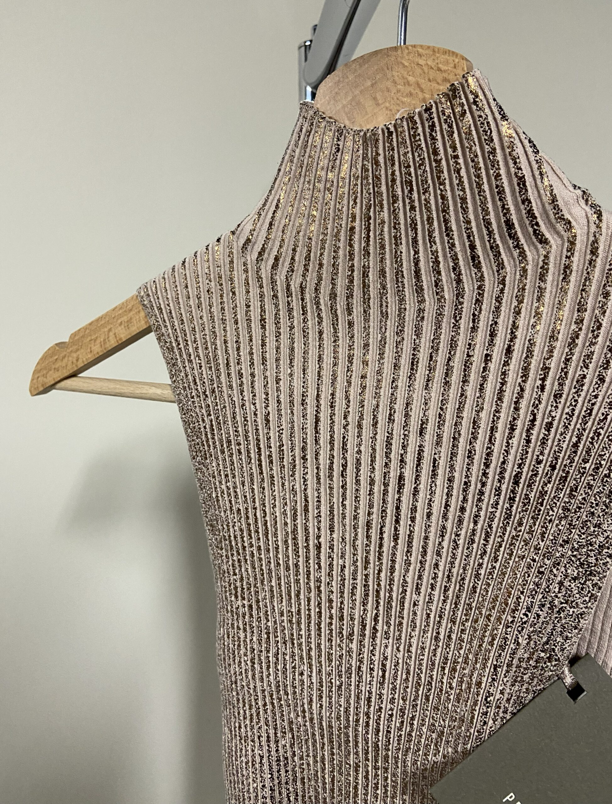 Il design è senza maniche, con scollo alto a lupetto che aderisce al collo.